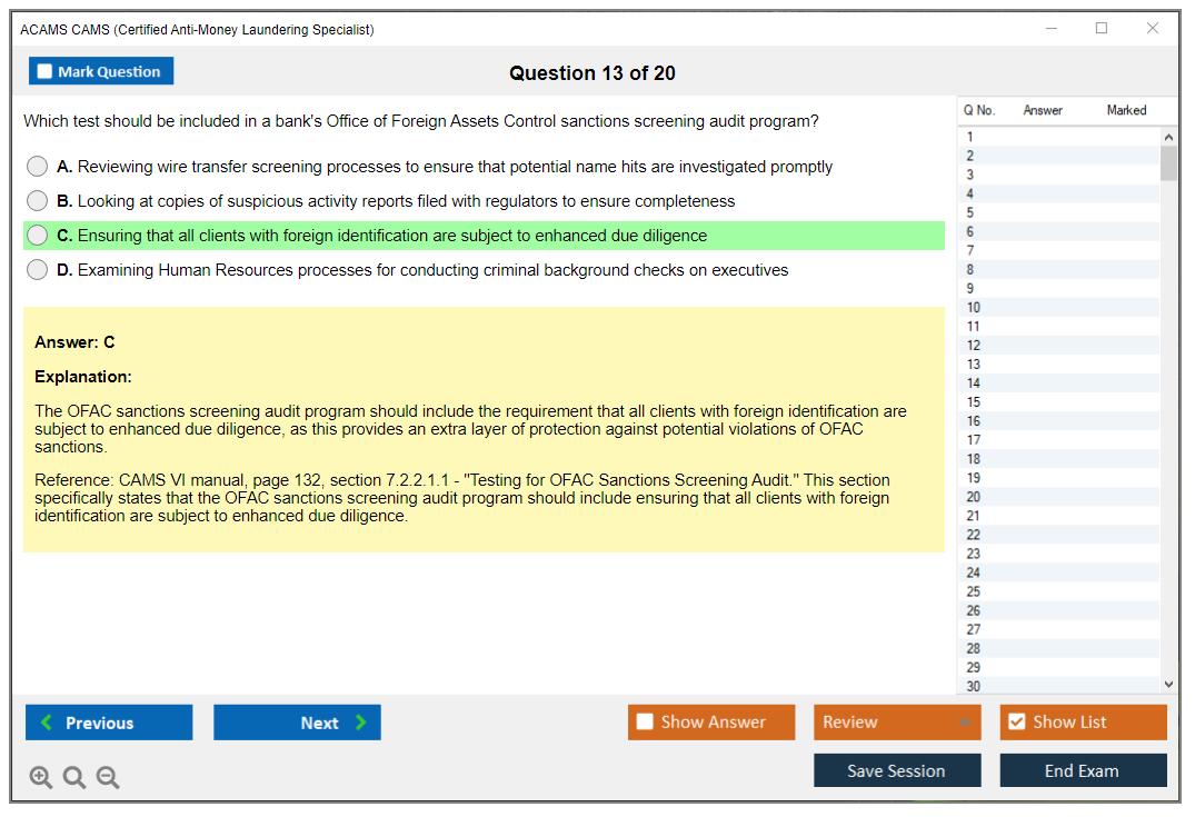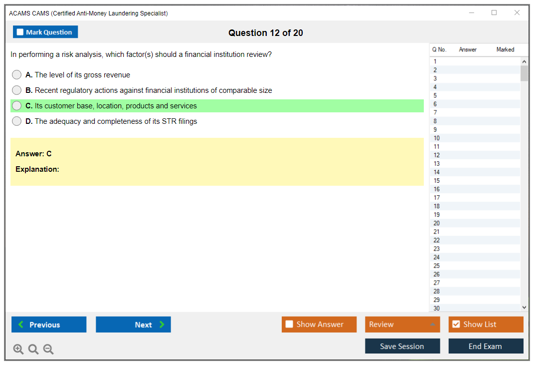 The ACAMS CAMS Exam is designed to assess the knowledge and skills of professionals in the field of anti-money laundering and financial crime prevention. It is a comprehensive test that covers various aspects of AML regulations, practices, and enforcement.