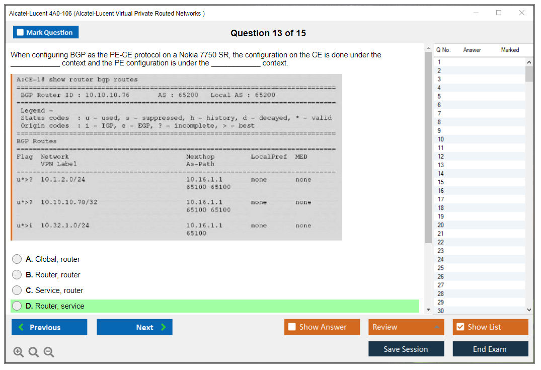 The Alcatel-Lucent 4A0-106 (Nokia Virtual Private Routed Networks) Exam is designed to test a candidate's knowledge and skills in configuring, managing, and troubleshooting Nokia's Virtual Private Routed Networks (VPRN). It is part of the Nokia Service Routing Certification (SRC) program.