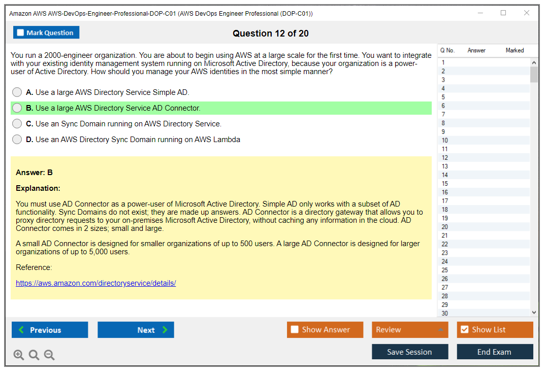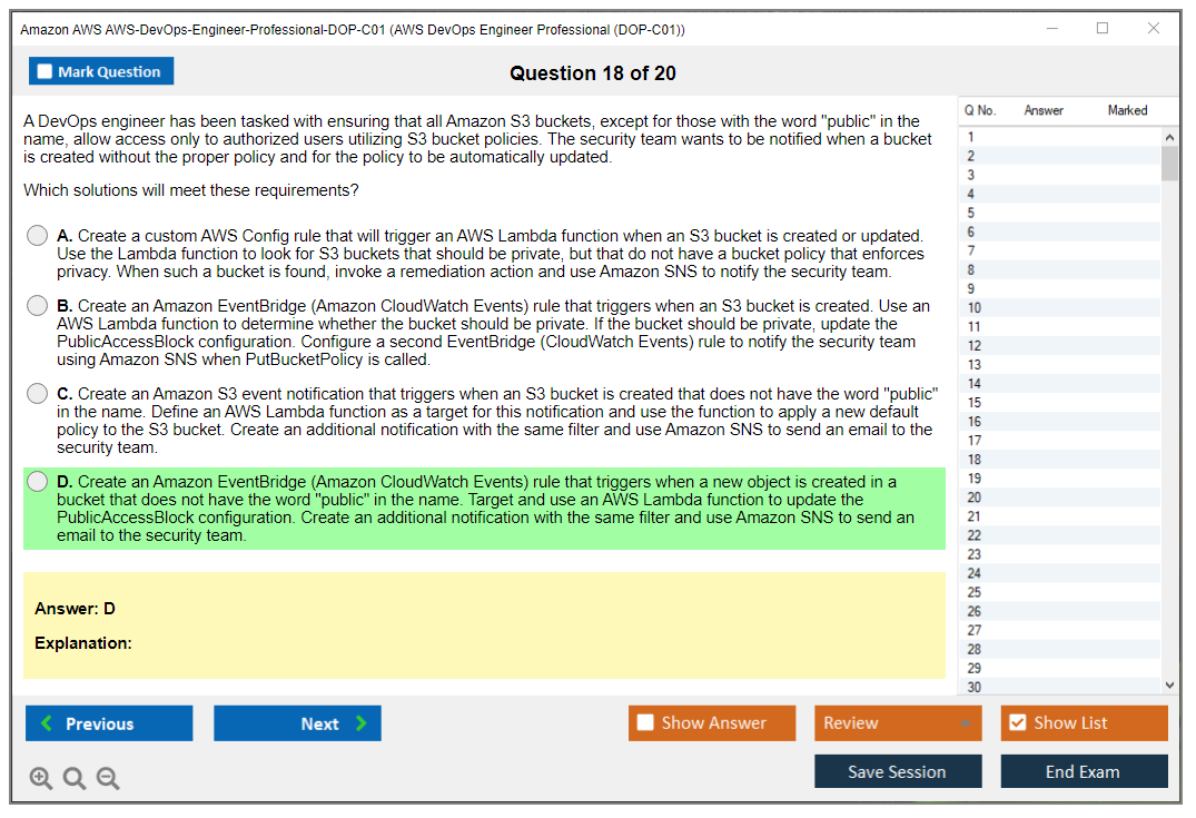 The Amazon AWS Certified DevOps Engineer - Professional (DOP-C01) exam is designed to test the knowledge and skills of individuals in the field of DevOps engineering, focusing on the AWS platform. It covers a range of topics including continuous delivery, automation of processes, monitoring and logging, security controls, governance, and compliance validation.