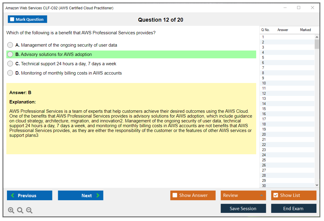 Crushed the awsCLF-C02 thanks to DumpsBoss! Their practice exams were fantastic - realistic questions that mirrored the actual exam format perfectly. Plus, the explanations were clear and helped me understand the concepts even deeper. Highly recommend!