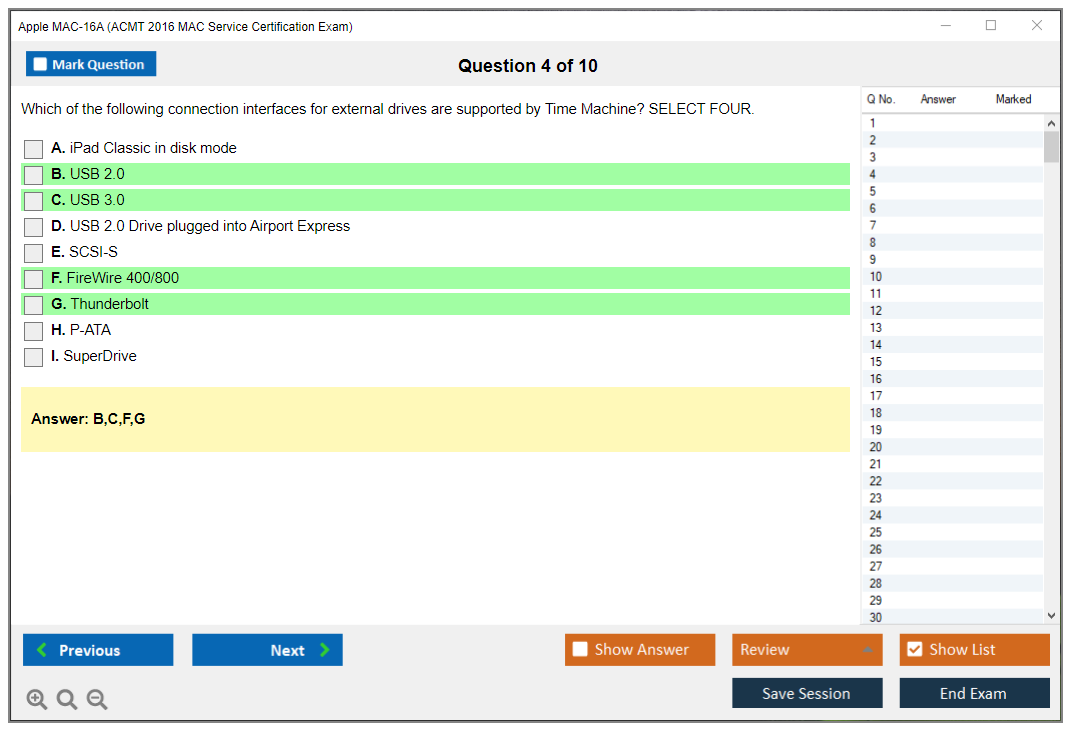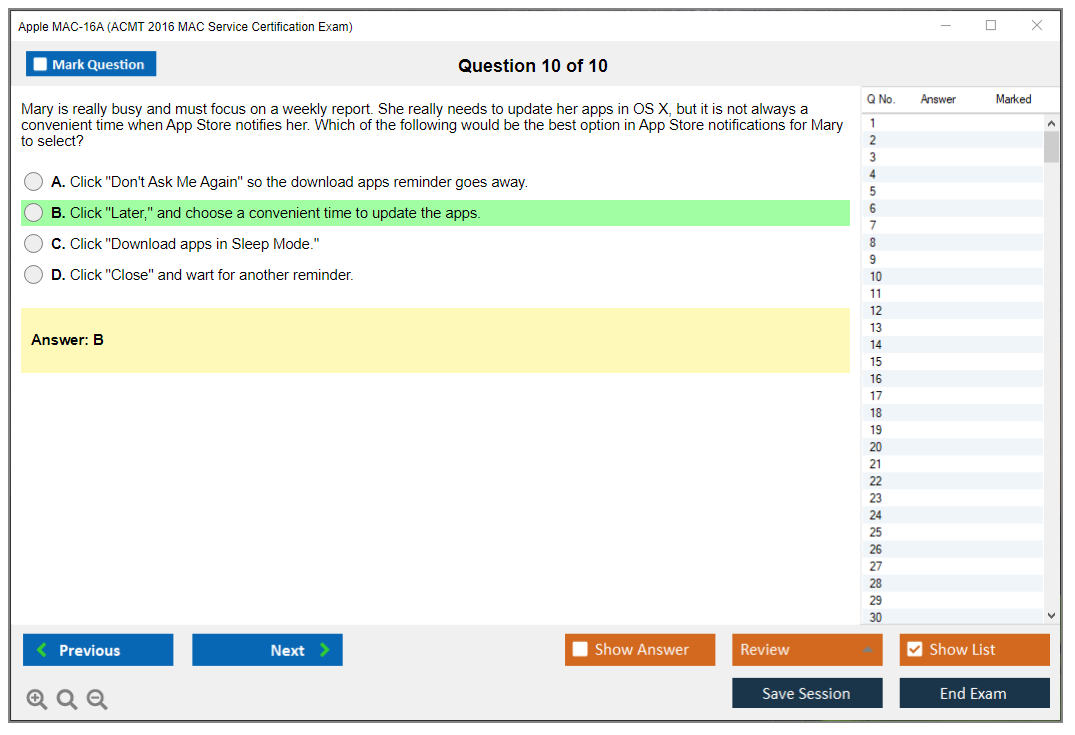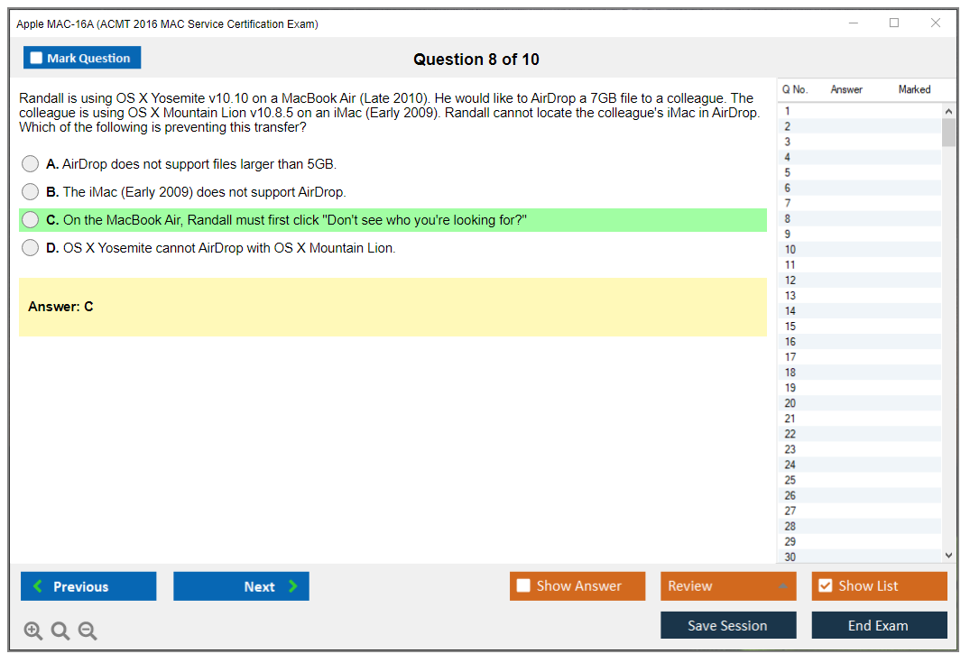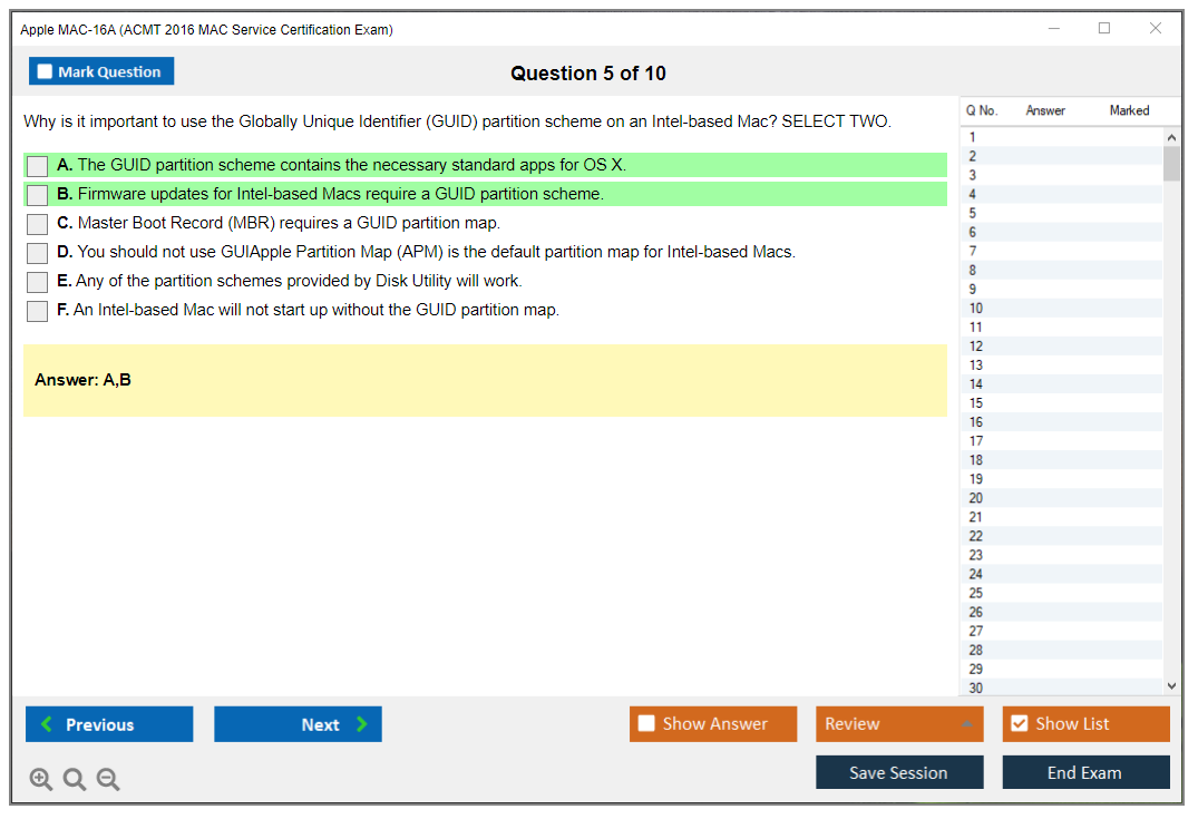 The question format of the Apple MAC-16A Exam includes multiple-choice questions, true/false questions, and scenario-based questions.