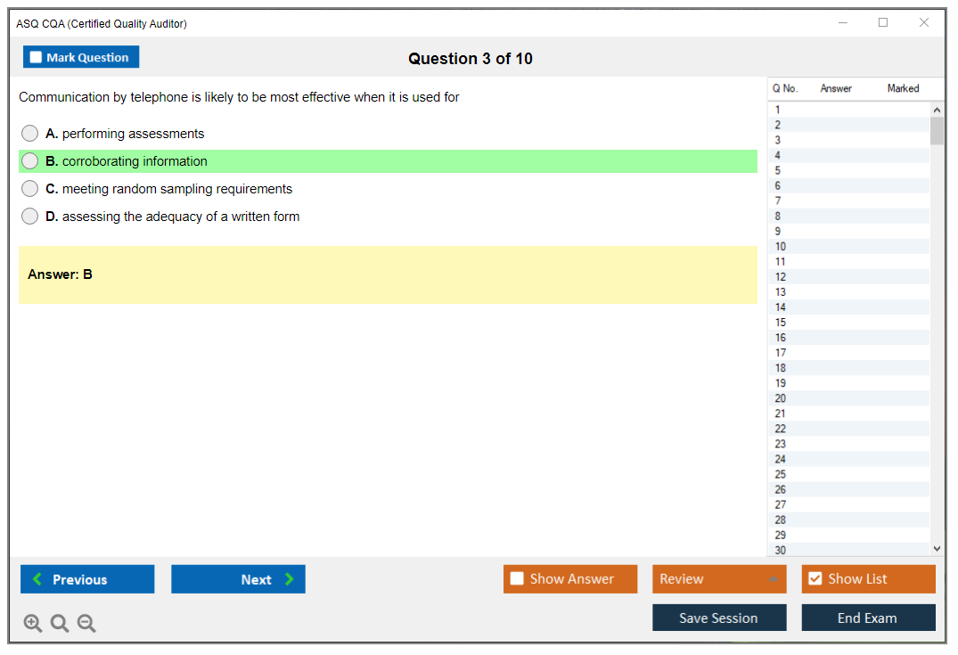 The ASQ Certified Quality Auditor (CQA) exam is a professional certification exam that evaluates an individual's understanding of the standards and principles of auditing, as well as the techniques of examining, questioning, evaluating, and reporting to determine a quality system's adequacy and deficiencies.