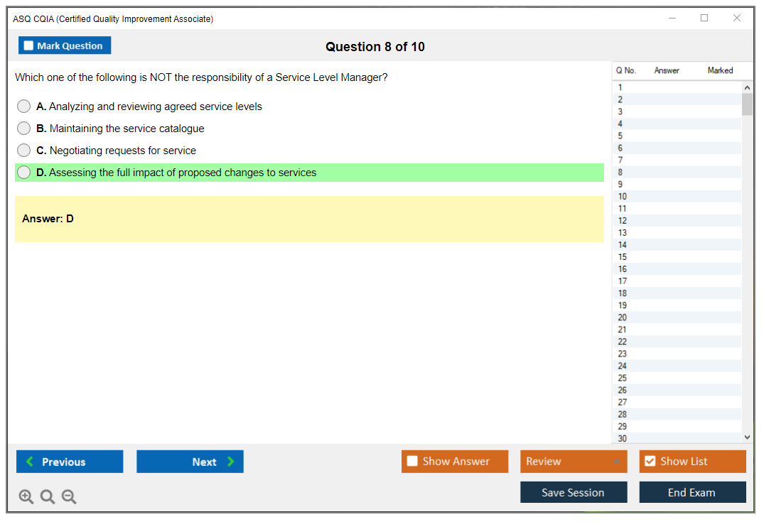 The ASQ CQIA exam features multiple-choice questions that assess the candidate's knowledge and application of quality improvement principles.