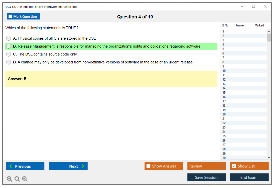 DumpsBoss é a minha plataforma preferida para o sucesso do ASQ CQIA. O material é minucioso e teve um papel crucial na minha conquista.