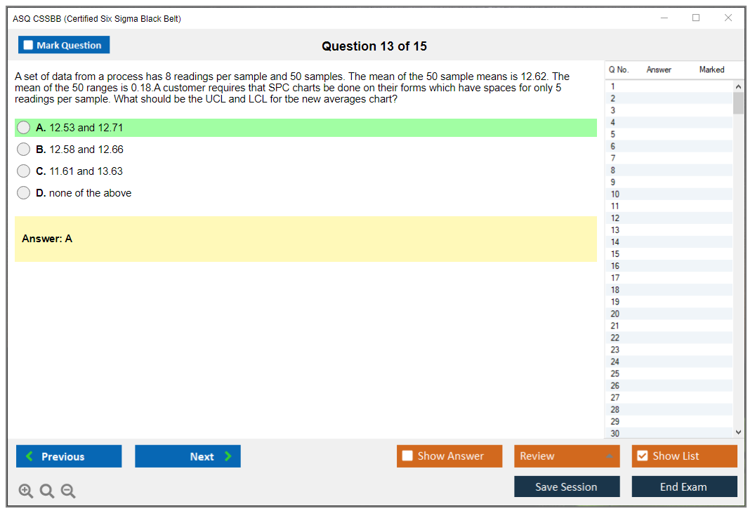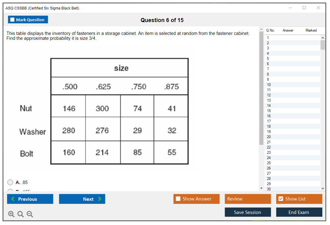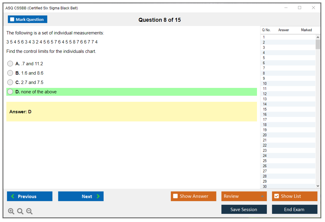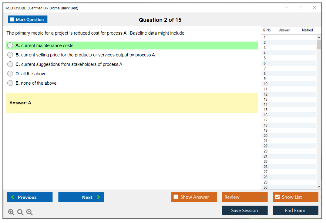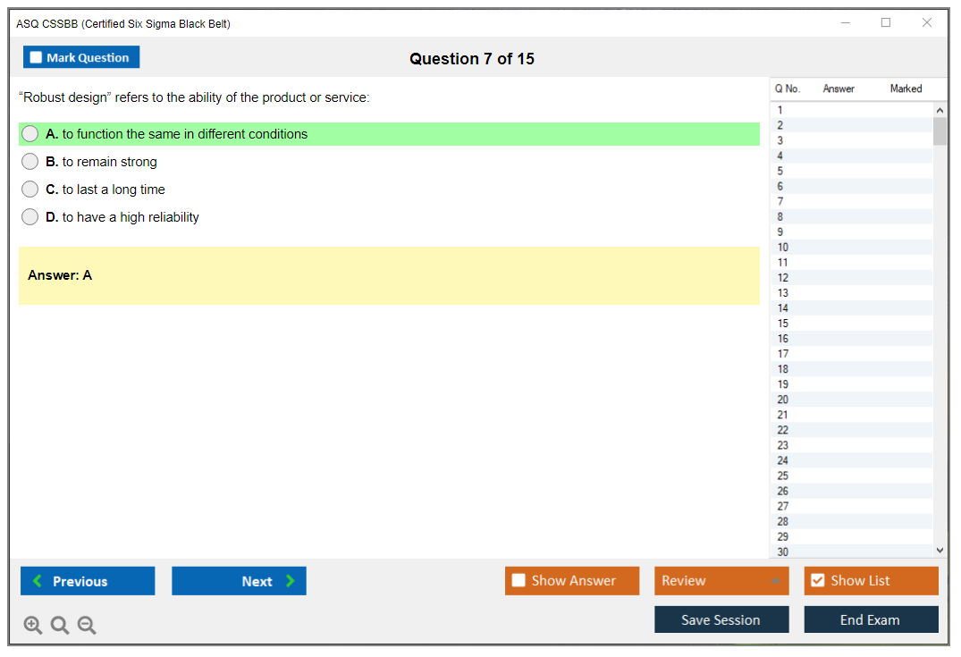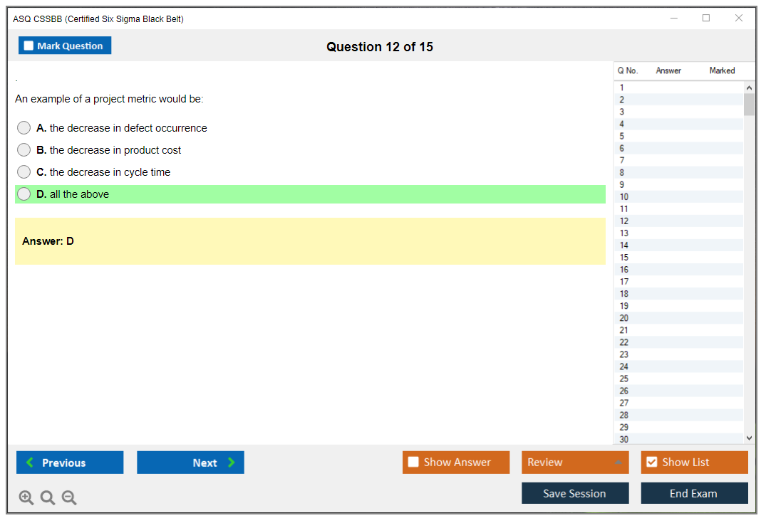 The ASQ CSSBB (Certified Six Sigma Black Belt) exam is a certification exam offered by the American Society for Quality (ASQ) for professionals who seek to demonstrate their expertise in Six Sigma methodologies and tools. The certification is designed for individuals who lead complex improvement projects and have a thorough understanding of Six Sigma principles.