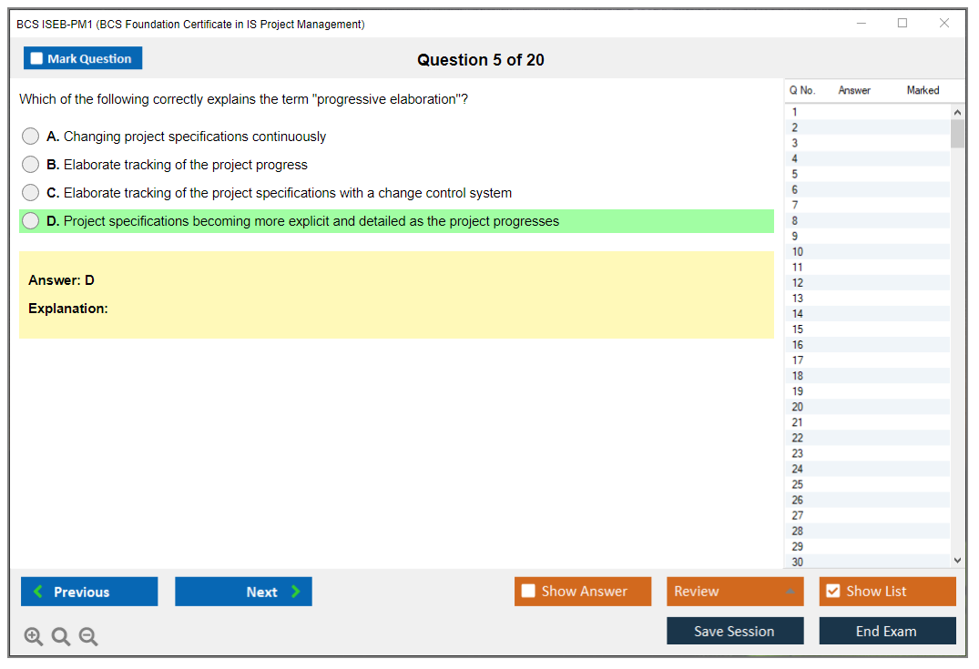 The BCS ISEB-PM1 (BCS Foundation Certificate in IS Project Management) exam is designed to provide candidates with a solid understanding of project management principles and practices within the context of information systems. It covers various aspects of project management, including planning, execution, and closing of projects.