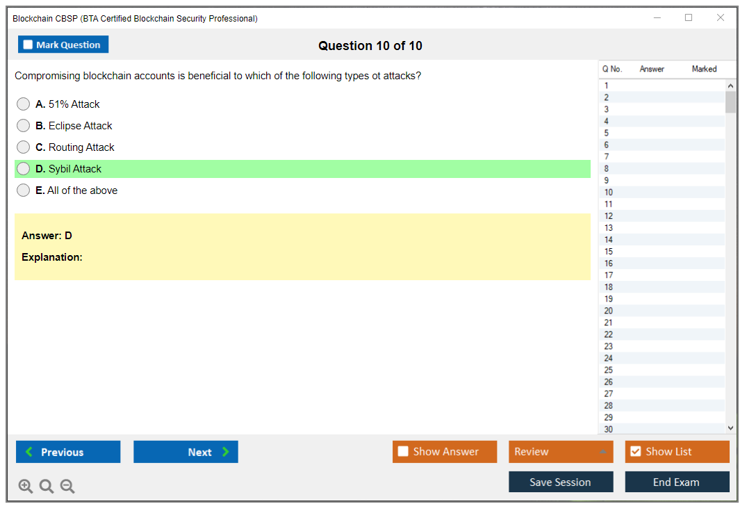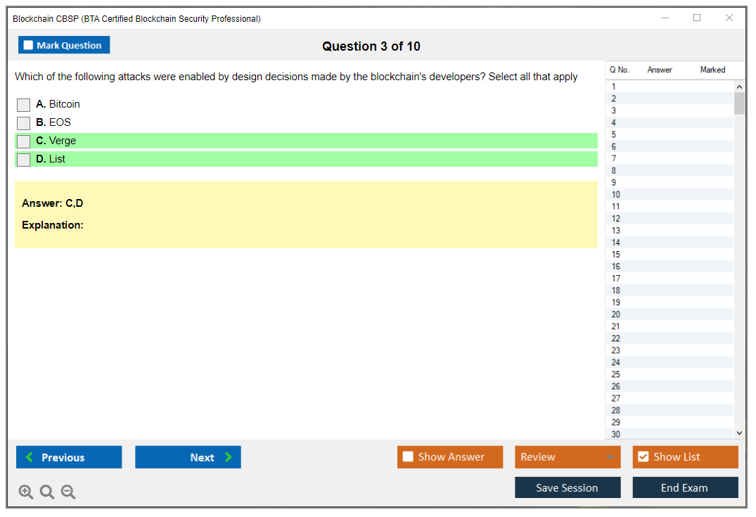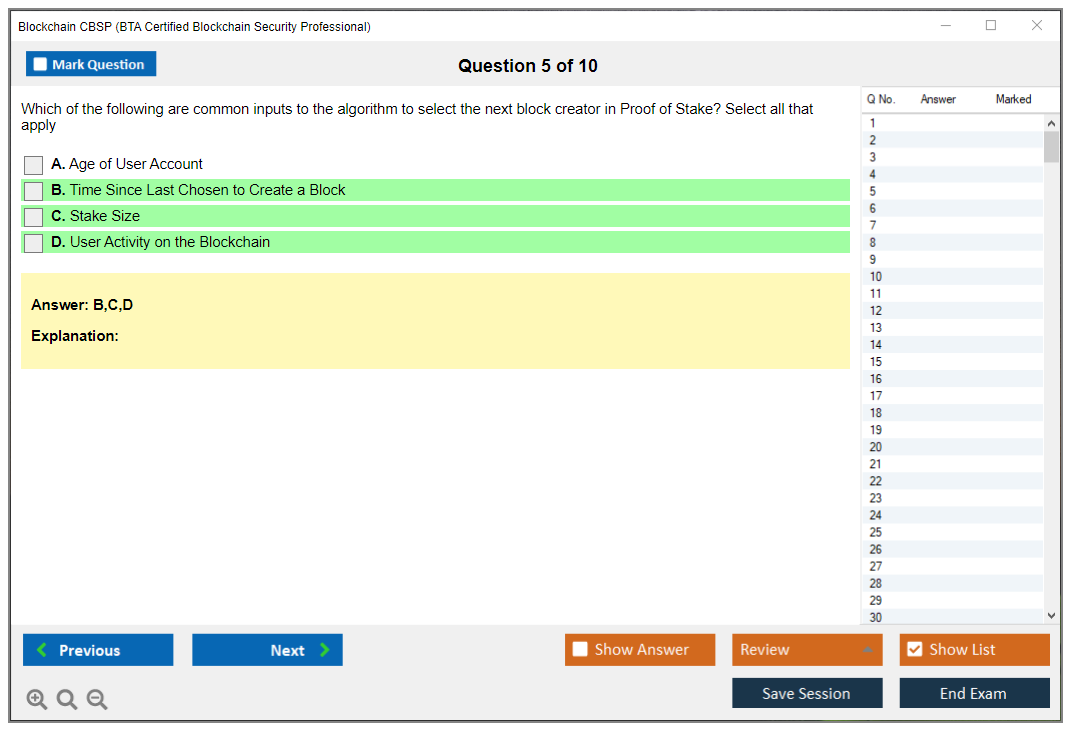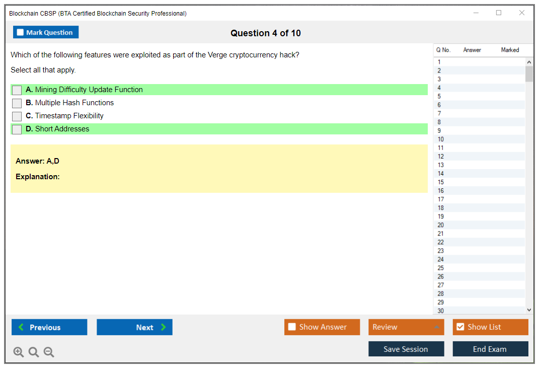 The Blockchain CBSP (BTA Certified Blockchain Security Professional) Exam is a certification exam designed to validate the knowledge and skills of individuals in blockchain security. It focuses on various aspects of blockchain technology, including its architecture, cryptography, and security best practices.