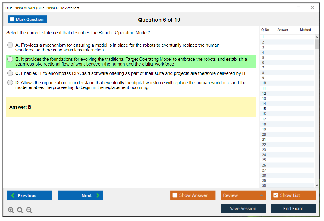 The Blue Prism ARA01 (Blue Prism Accredited ROM Architect Exam) is designed to test a candidate's knowledge and skills in designing and implementing a Blue Prism Robotic Operating Model (ROM). It validates the competency of individuals in the areas of governance, delivery management, and operational support within a Blue Prism environment.