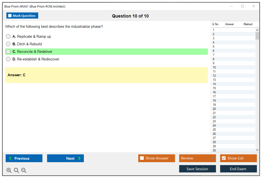 The Blue Prism ARA01 Exam assesses the ability to architect and implement a Blue Prism Robotic Operating Model (ROM), ensuring that candidates possess the necessary knowledge and skills for governance, delivery management, and operational support.