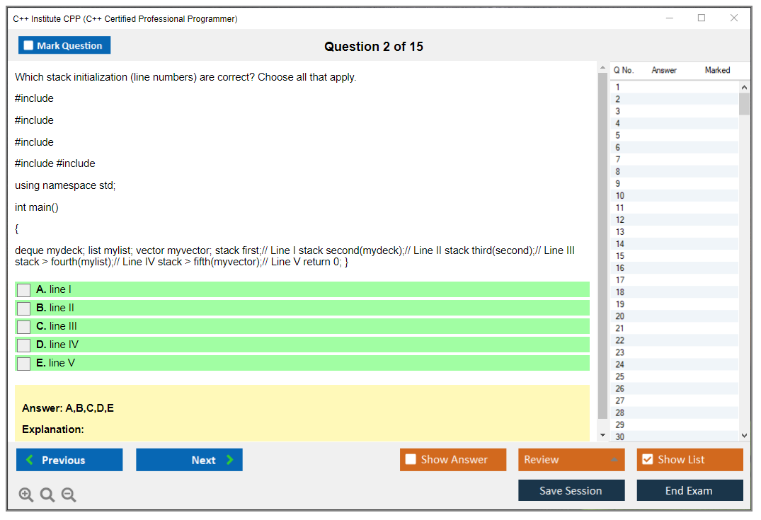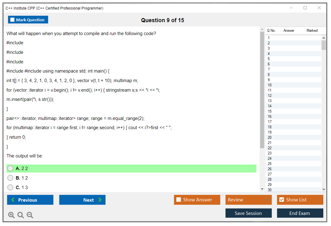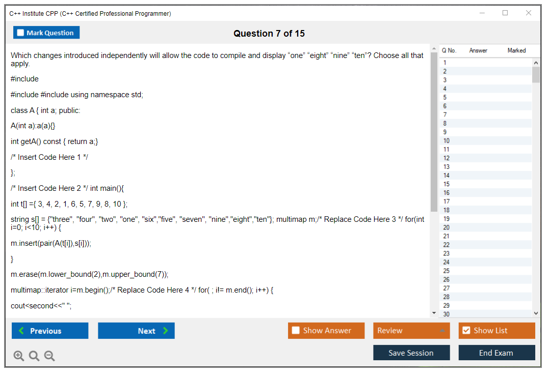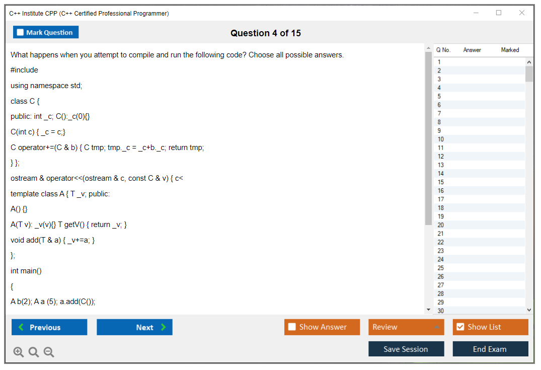 The question format of the C++ Institute CPP Exam includes multiple-choice questions, with both single and multiple correct answers.