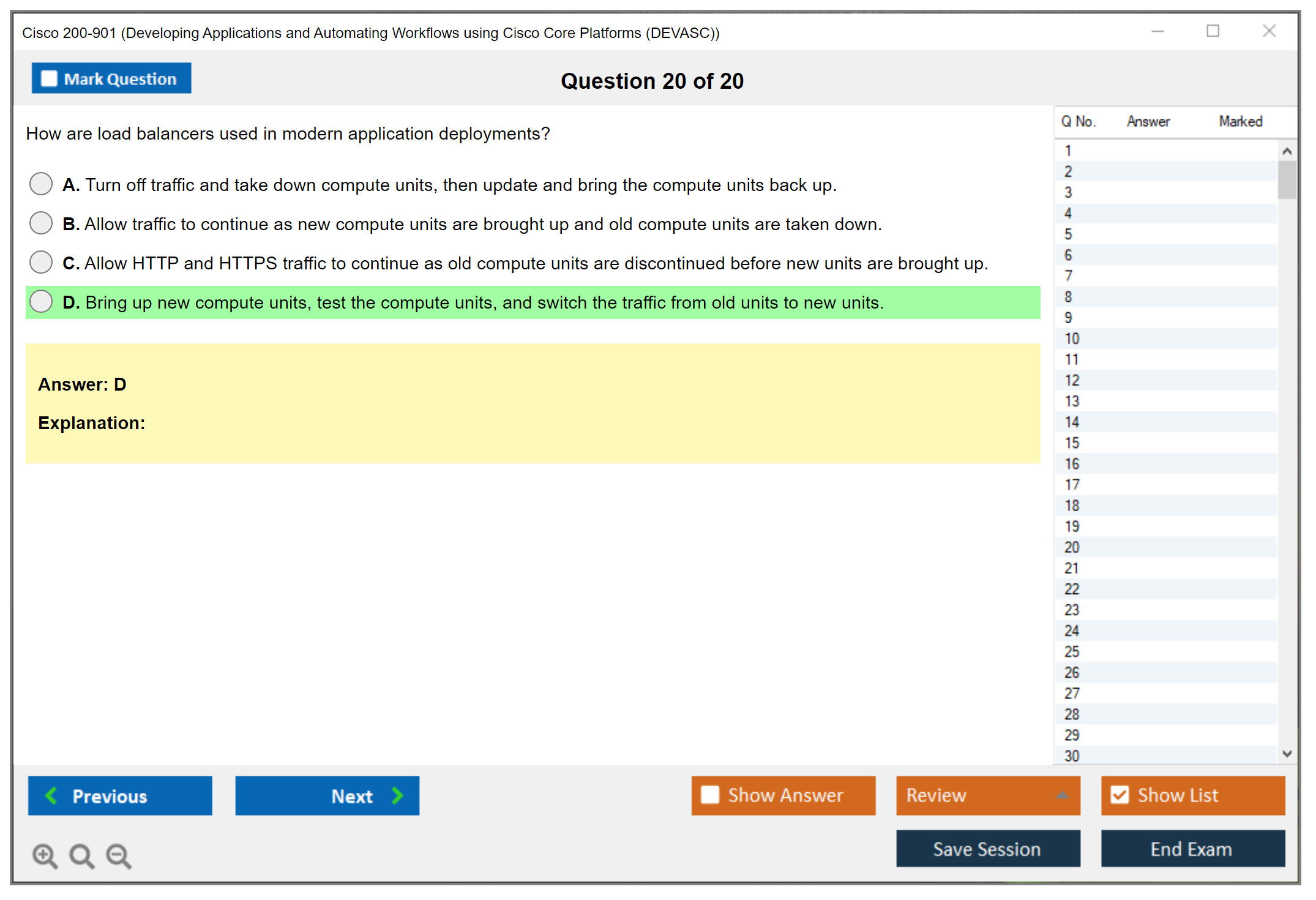 The Cisco 200-901 (DevNet Associate (DEVASC)) Exam is designed for developers and network engineers to validate their skills in developing and maintaining applications built on Cisco platforms. It covers foundational knowledge in software development and design, understanding and using APIs, Cisco platforms and development, application deployment and security, and infrastructure and automation.