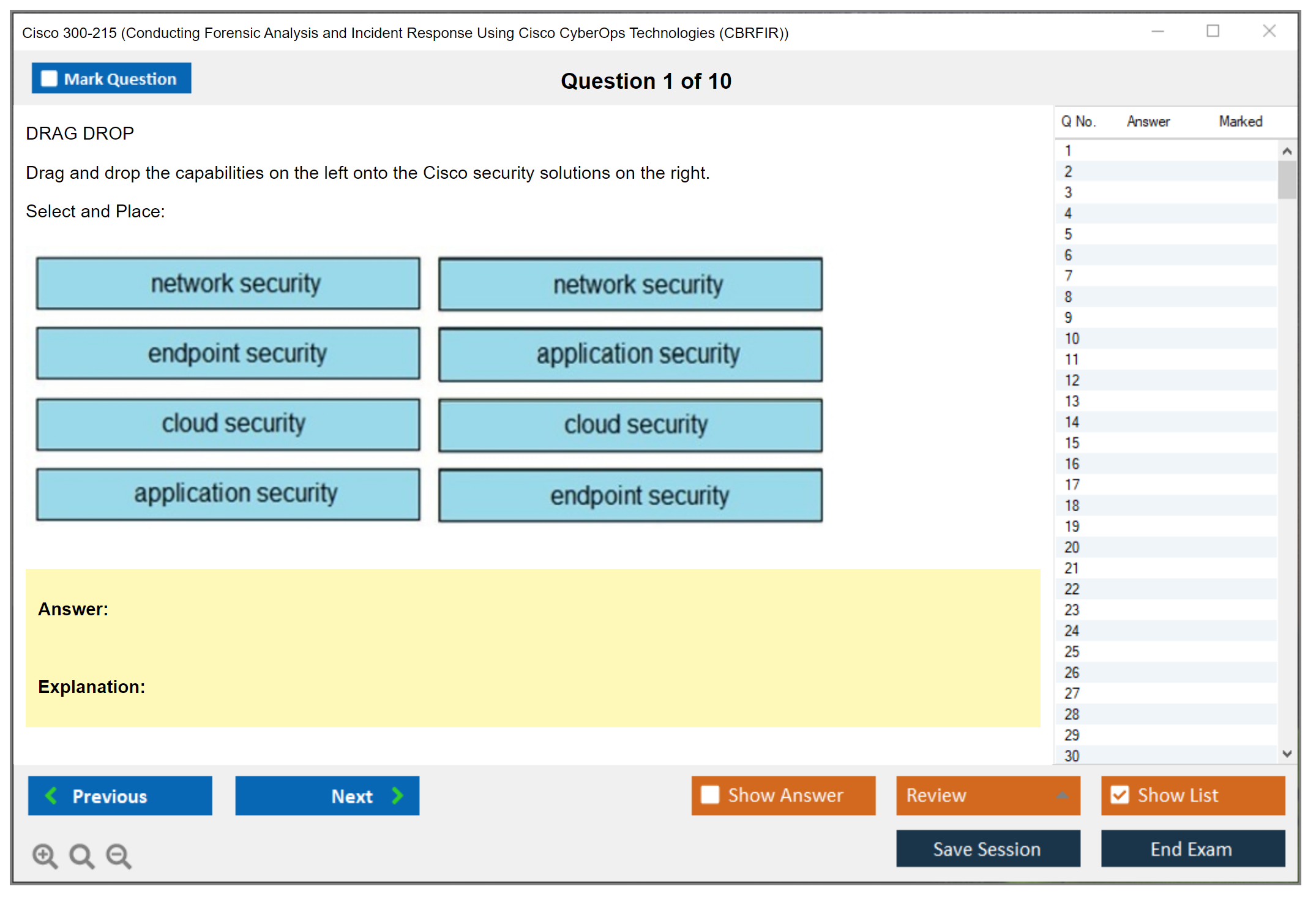 The question format of the Cisco 300-215 exam includes multiple-choice, drag-and-drop, and simulation-based questions.
