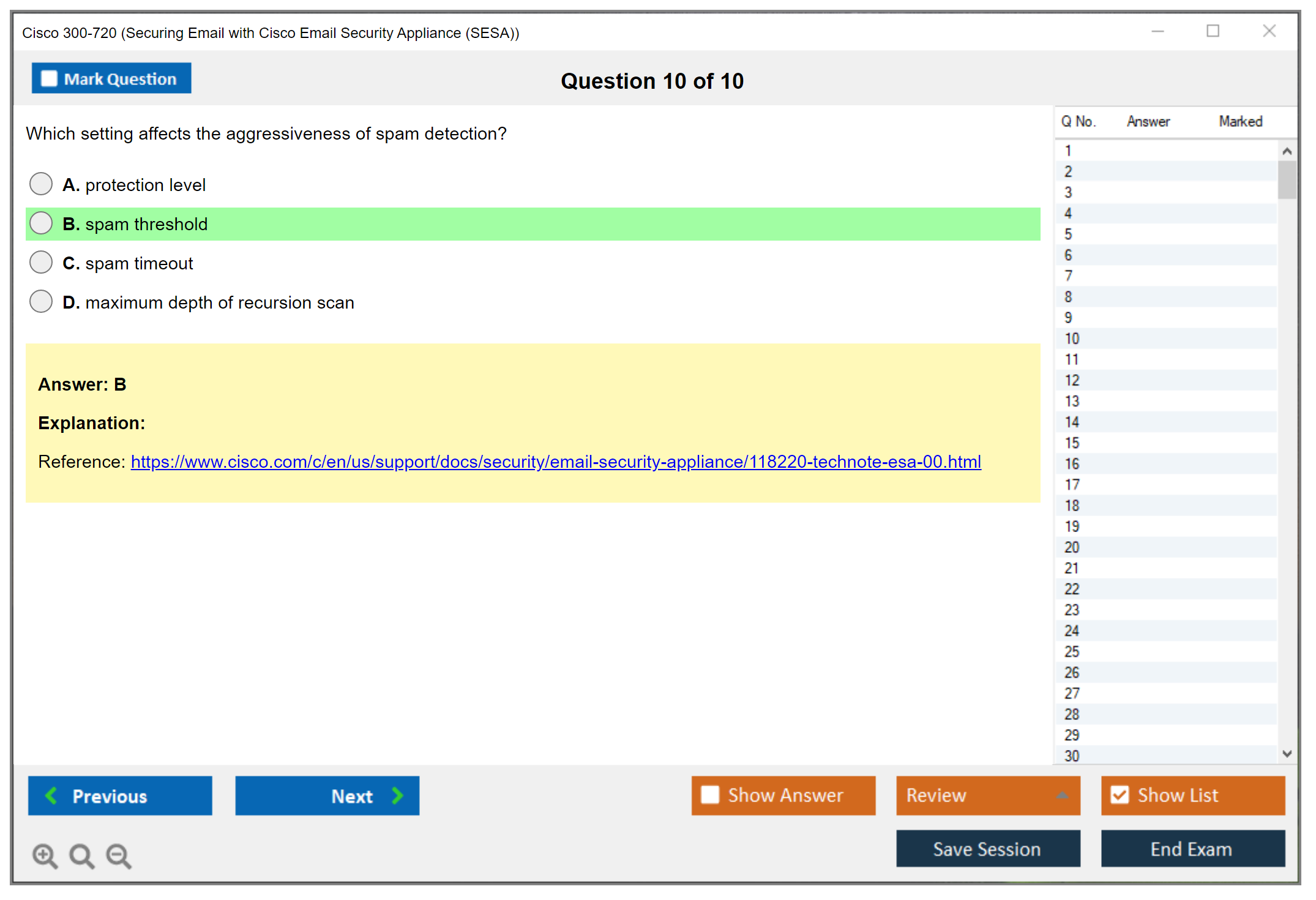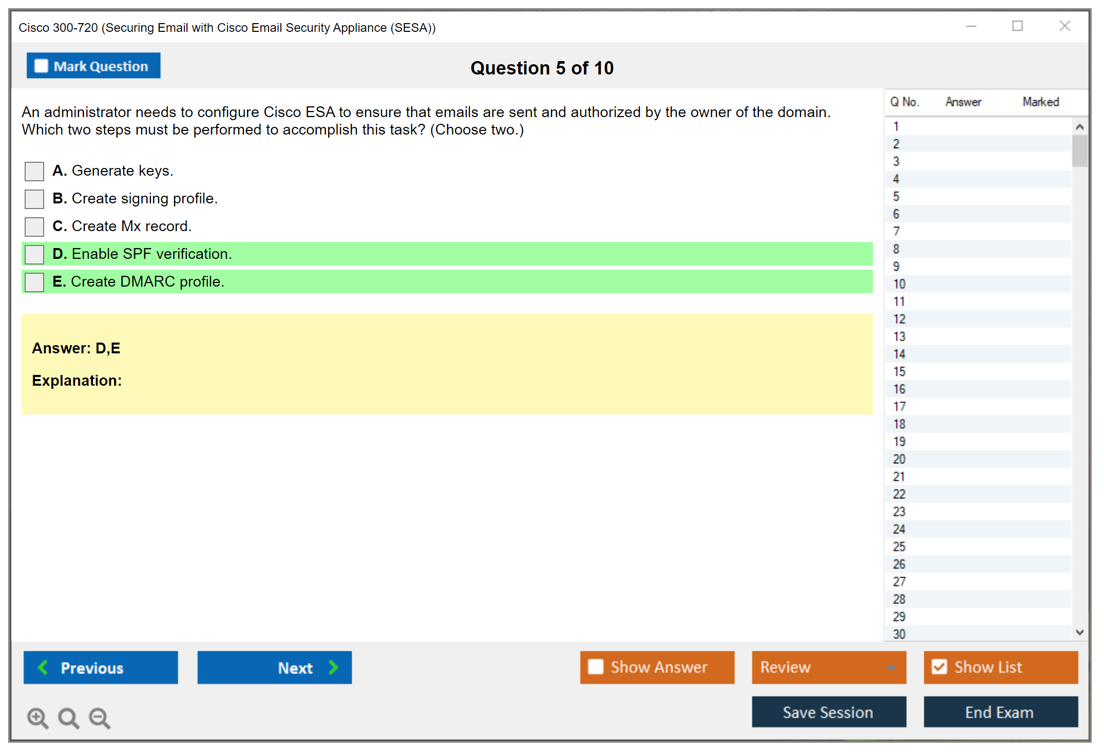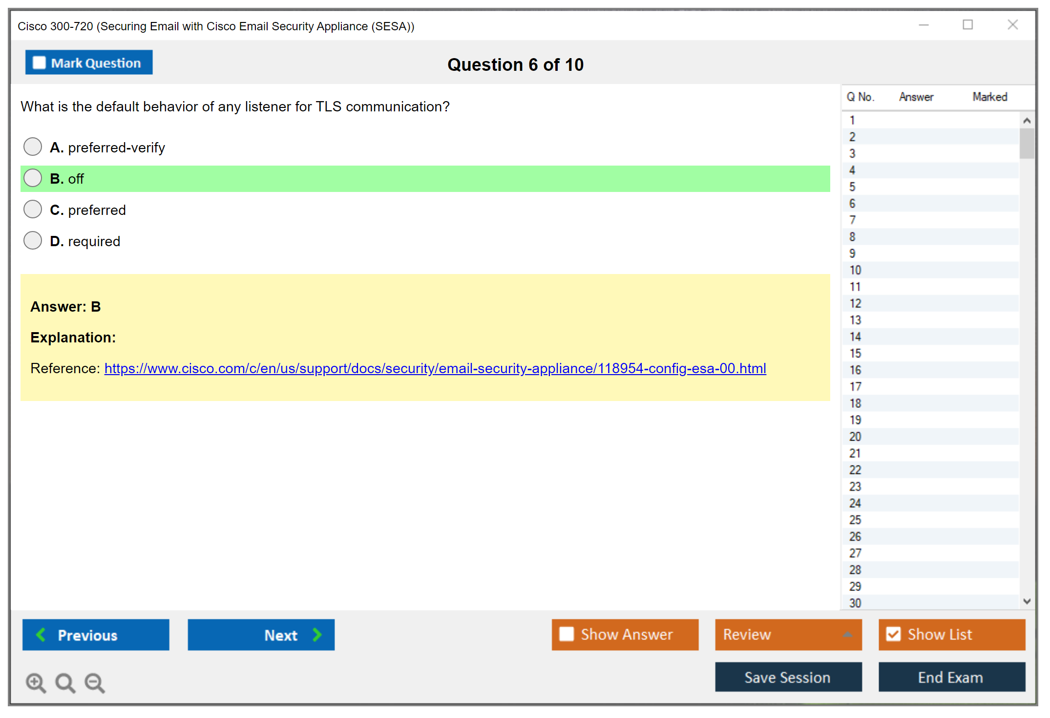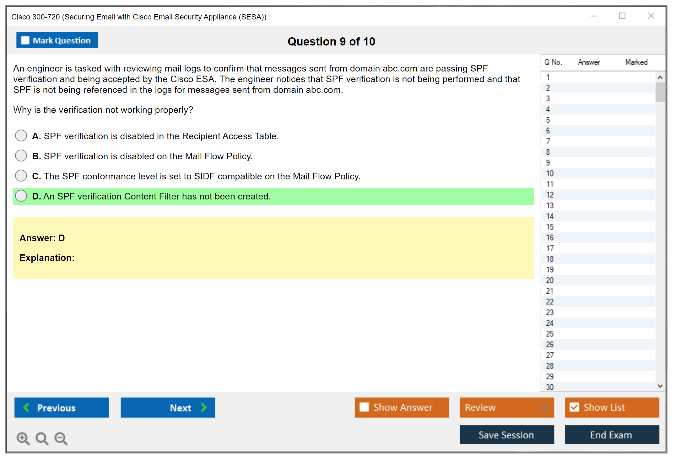 The Cisco 300-720 (Securing Email with Cisco Email Security Appliance (300-720 SESA)) exam is designed to validate the knowledge and skills required to secure email communication using Cisco Email Security Appliance. This exam is part of the Cisco Certified Specialist - Email Content Security certification and is also a concentration exam for the CCNP Security certification.