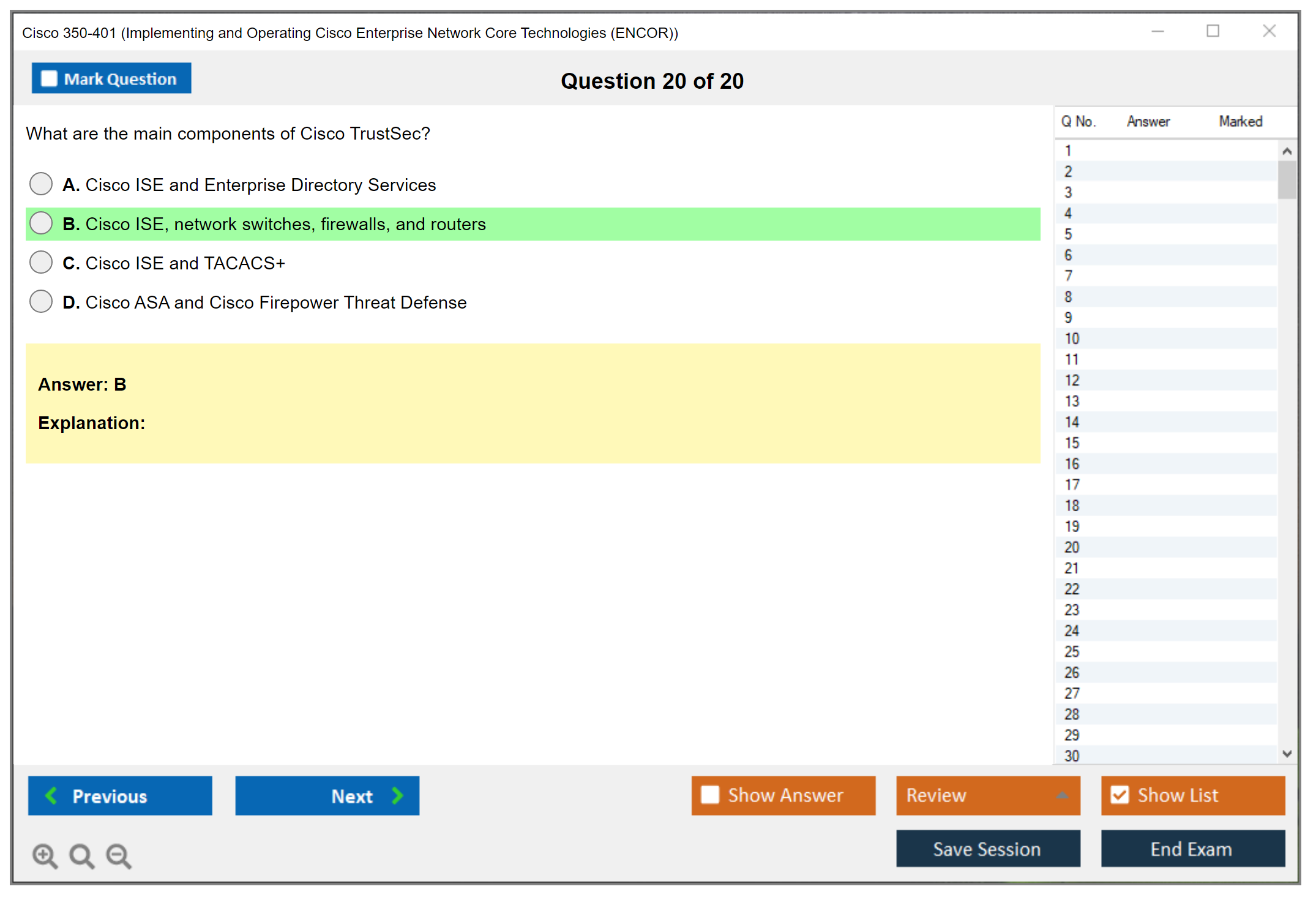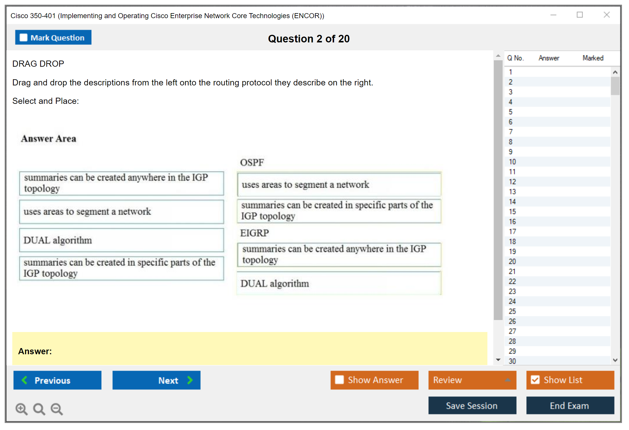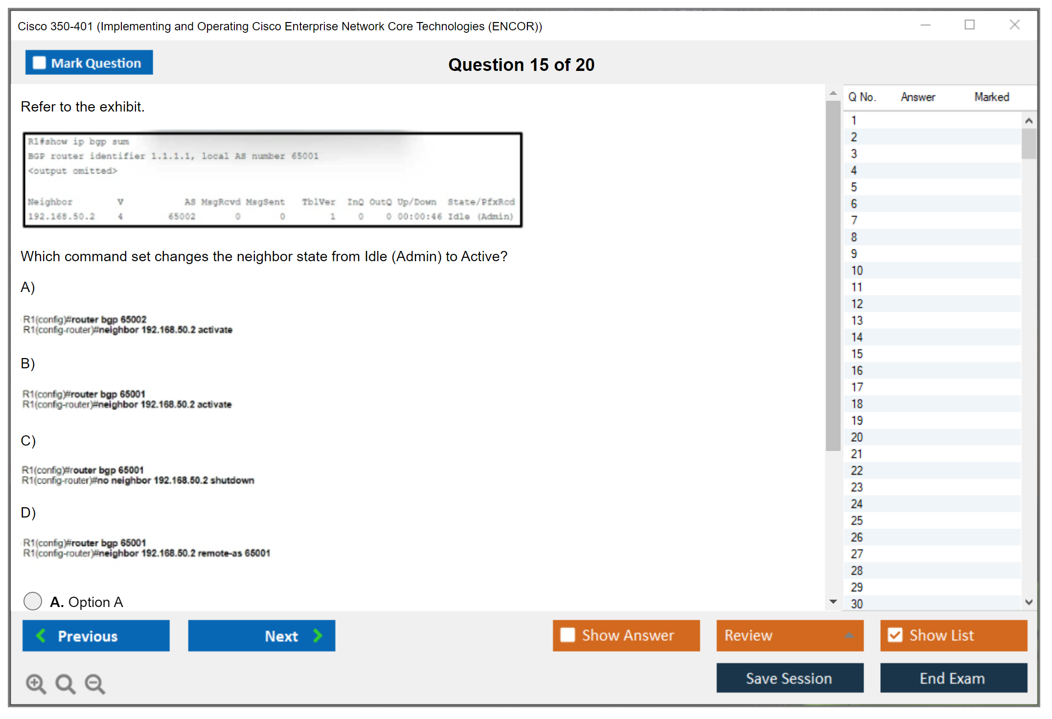 DumpsBoss provided a fantastic platform to test my knowledge for the Cisco 350-401 ENCOR exam. Their practice tests were challenging yet approachable, mimicking the real exam format perfectly. The explanations for each answer were clear and concise, helping me identify areas needing further study. I highly recommend DumpsBoss to anyone preparing for their Cisco certification.