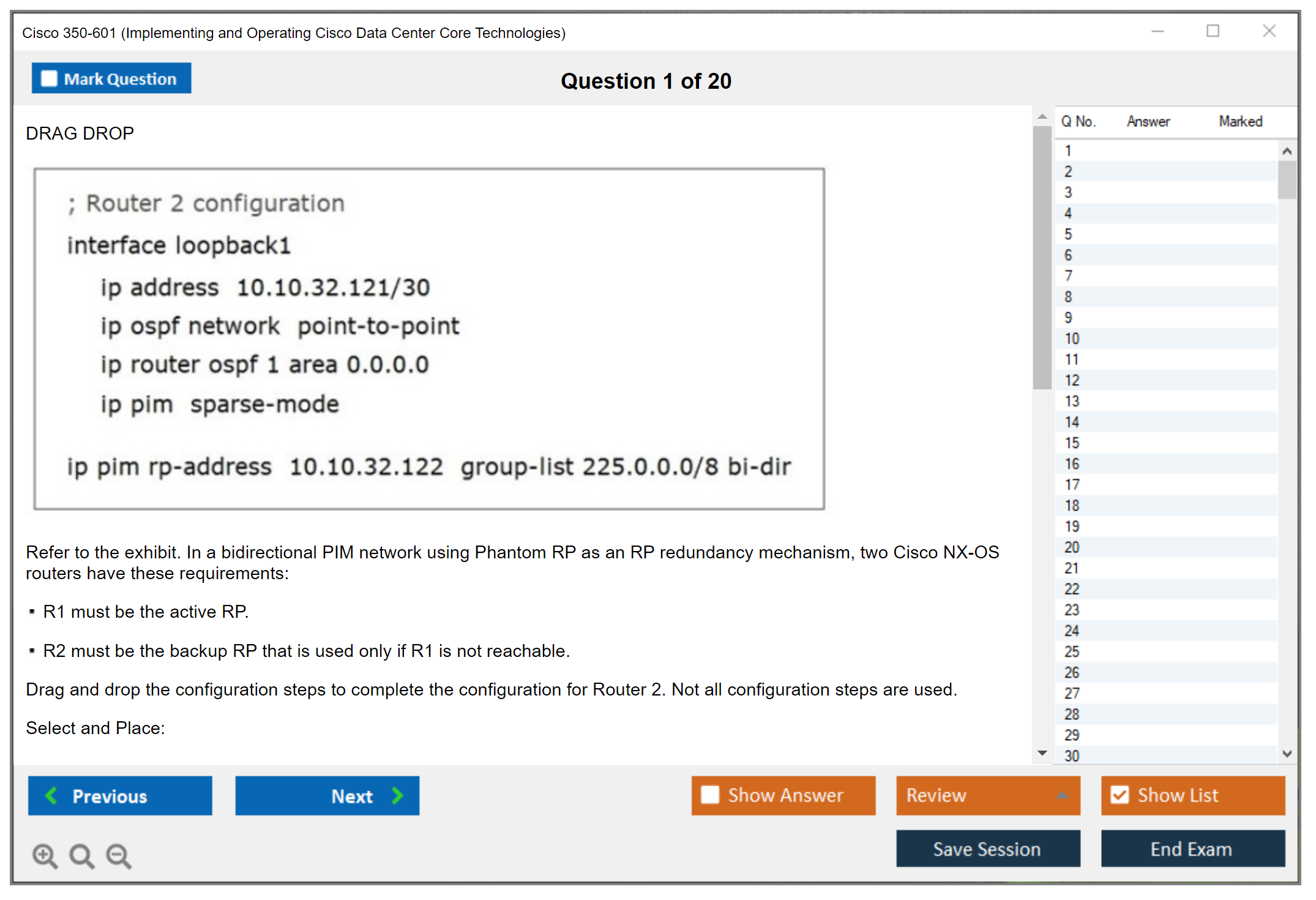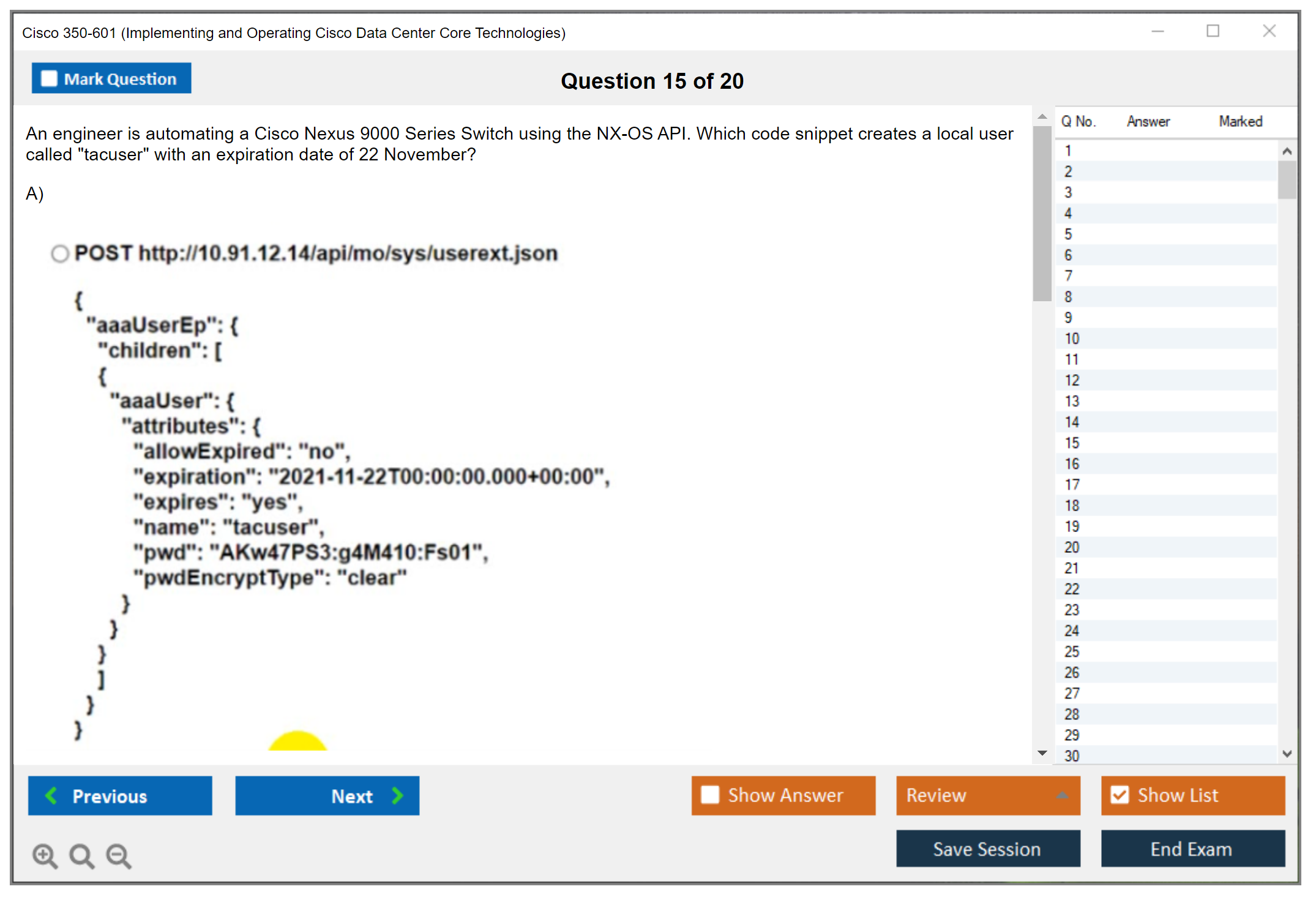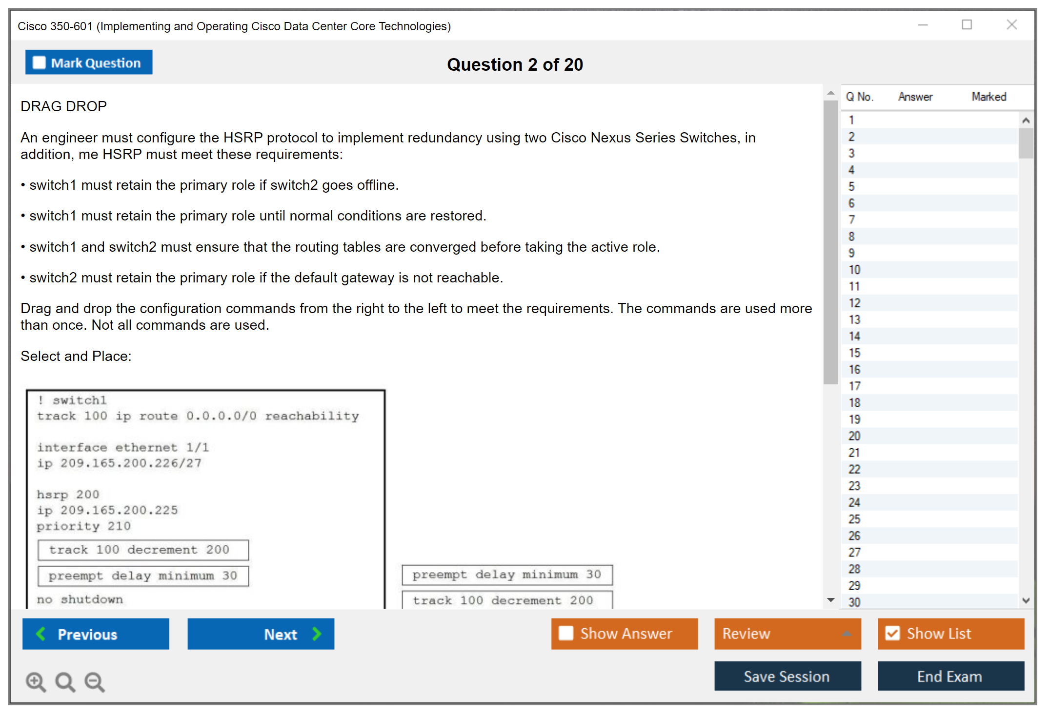The question format of the Cisco 350-601 exam includes multiple-choice questions, drag-and-drop questions, and simulations.