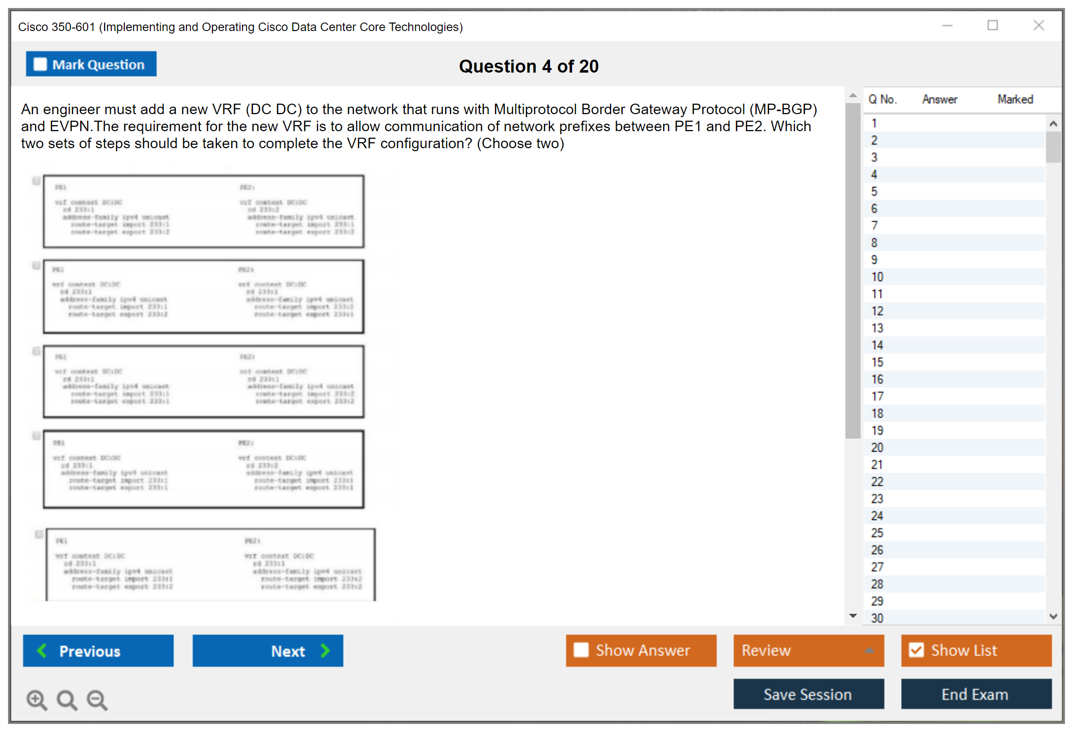 Sample questions for the Cisco 350-601 exam can be found on Cisco's official website or through Cisco's exam preparation resources and study guides.