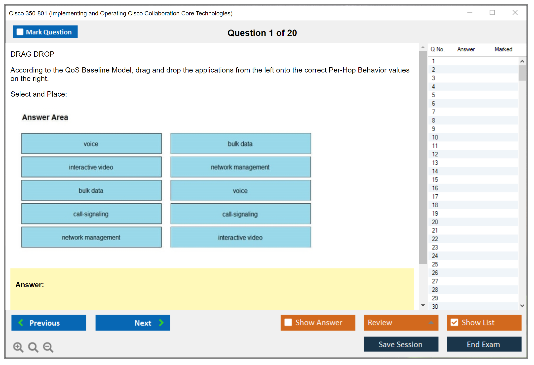 The question format of the Cisco 350-801 exam includes multiple-choice questions, drag-and-drop questions, and simulations.