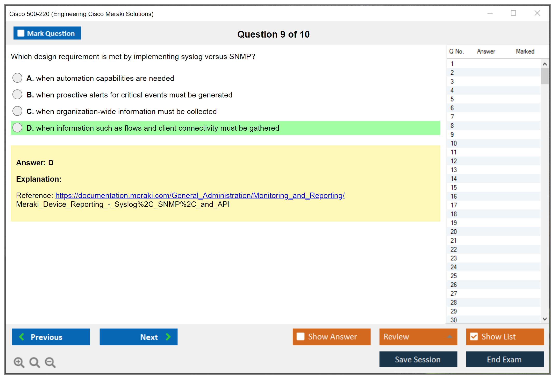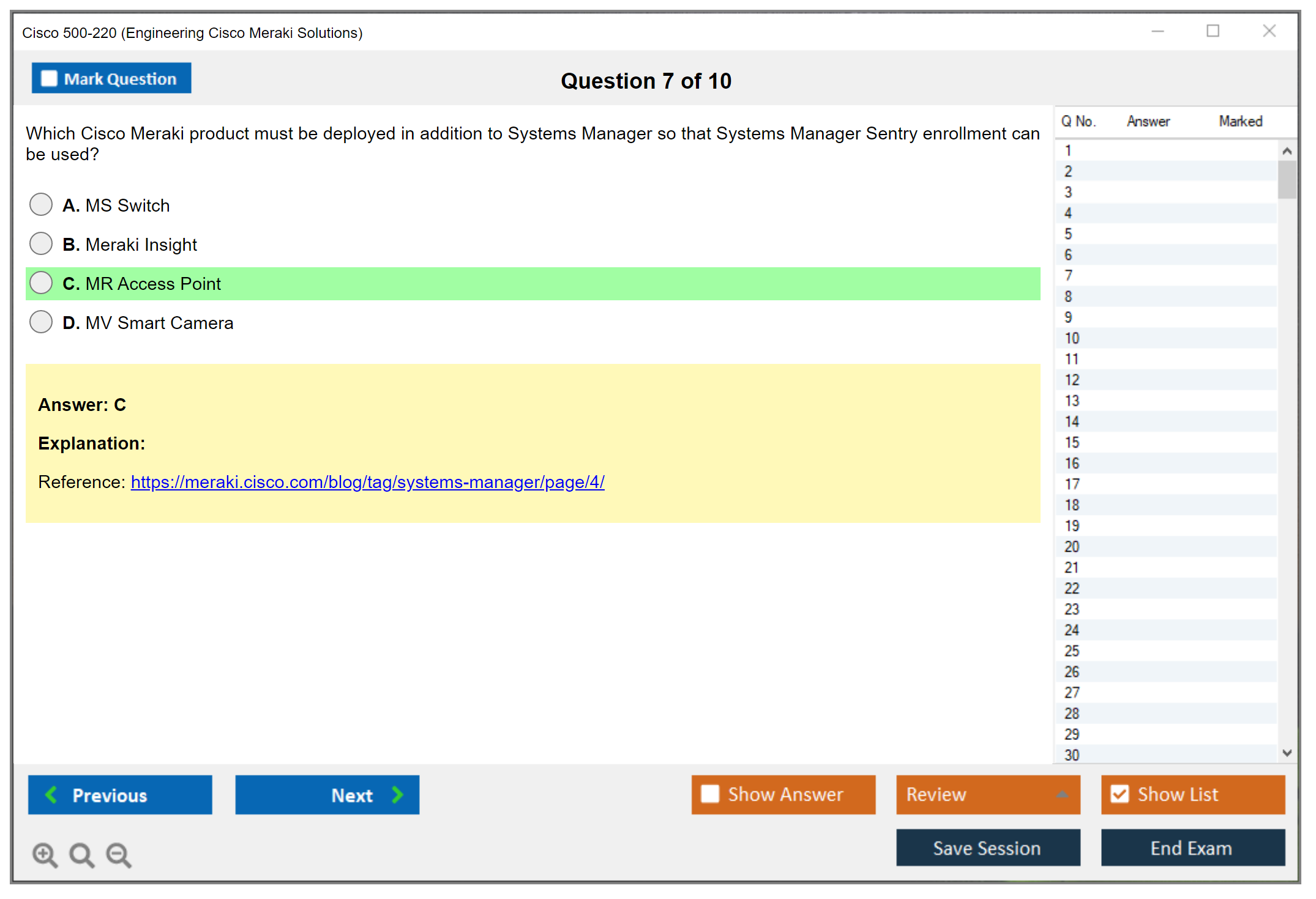 The Cisco 500-220 (Engineering Cisco Meraki Solutions (ECMS) v2.2) Exam is designed to test a candidate's knowledge and skills in deploying, configuring, and troubleshooting Cisco Meraki solutions.