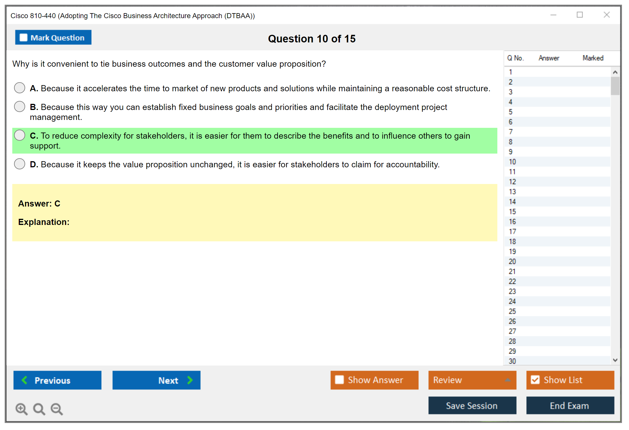 The Cisco 810-440 (Adopting The Cisco Business Architecture Approach (DTBAA)) exam is designed to test a candidate's understanding of the principles and practices involved in adopting a business architecture approach with Cisco solutions. It focuses on the alignment of business and IT strategies, business outcomes, and the development of a business architecture practice.