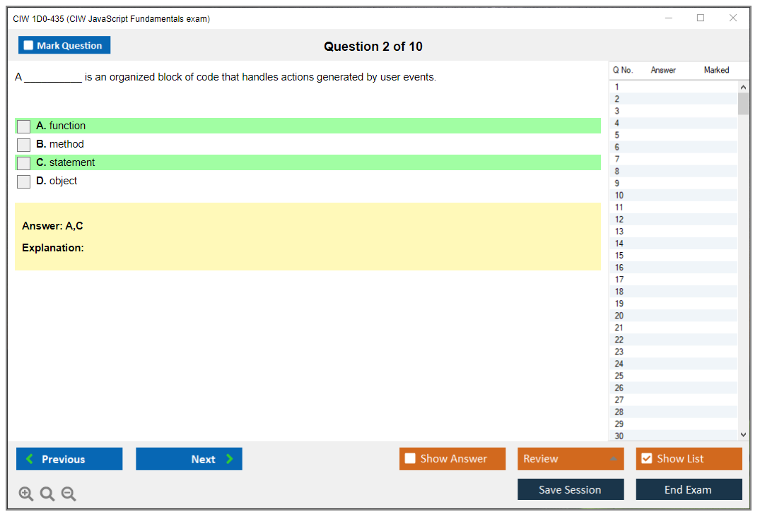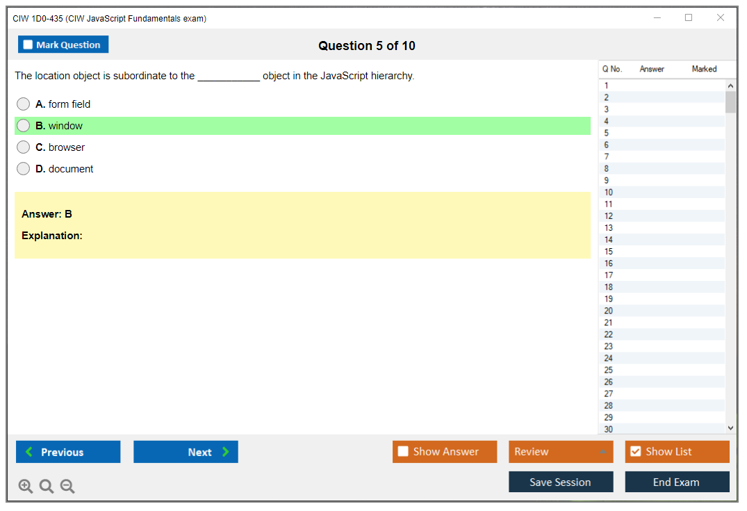 The CIW 1D0-435 (CIW JavaScript Fundamentals) exam is designed to test a candidate's knowledge and skills in using JavaScript for web development. It covers topics such as JavaScript syntax, control structures, functions, events, and object-oriented programming concepts.