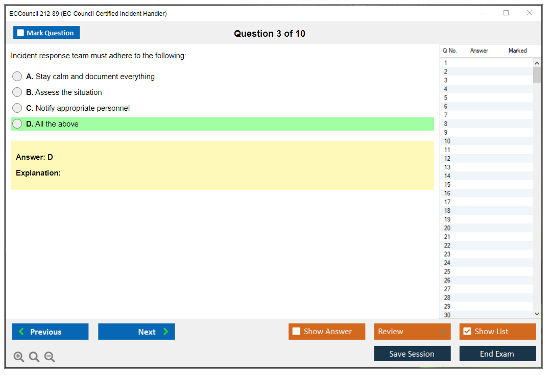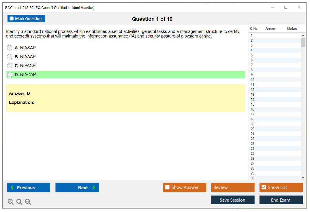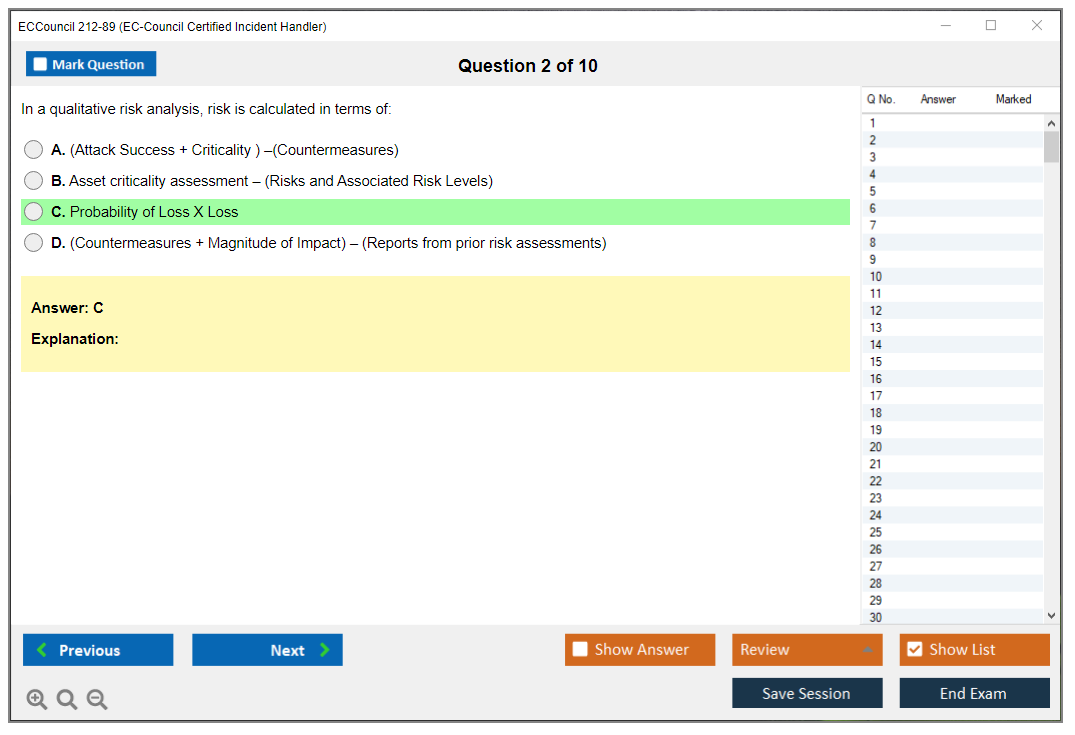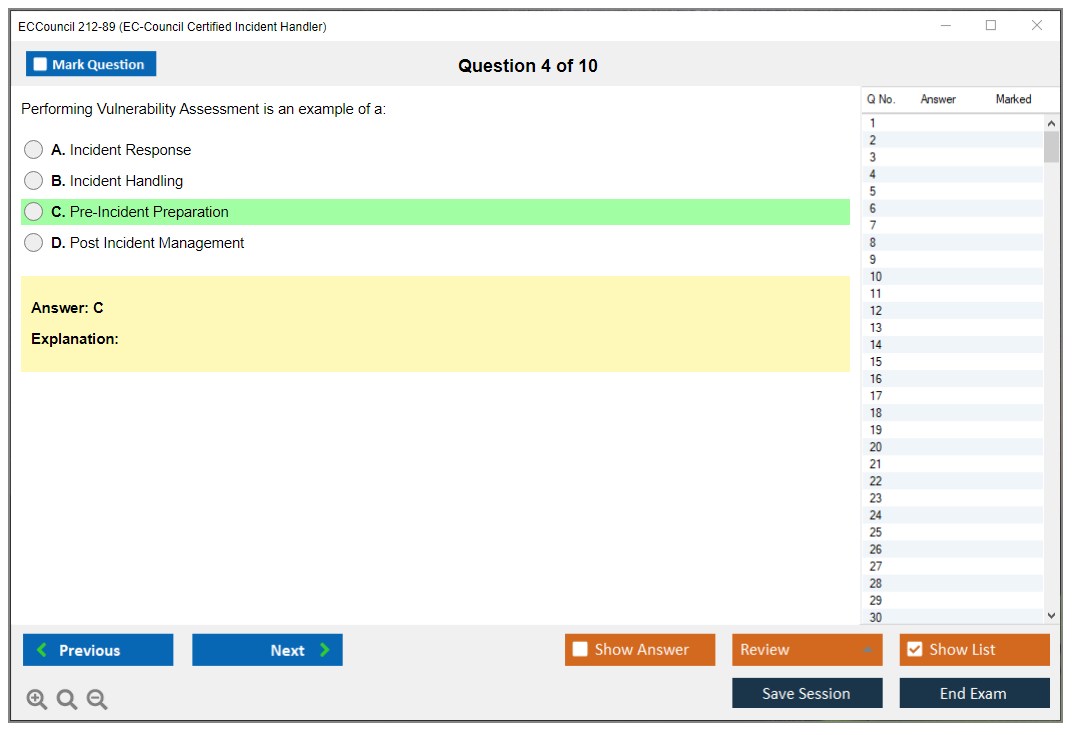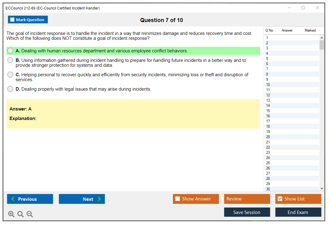 The ECCouncil 212-89 (EC Council Certified Incident Handler (ECIH v2)) Exam is a certification exam designed to validate the skills and knowledge required to effectively handle and respond to various types of cybersecurity incidents in an organization. It focuses on incident handling and response, covering areas such as preparation, identification, containment, eradication, recovery, and lessons learned.