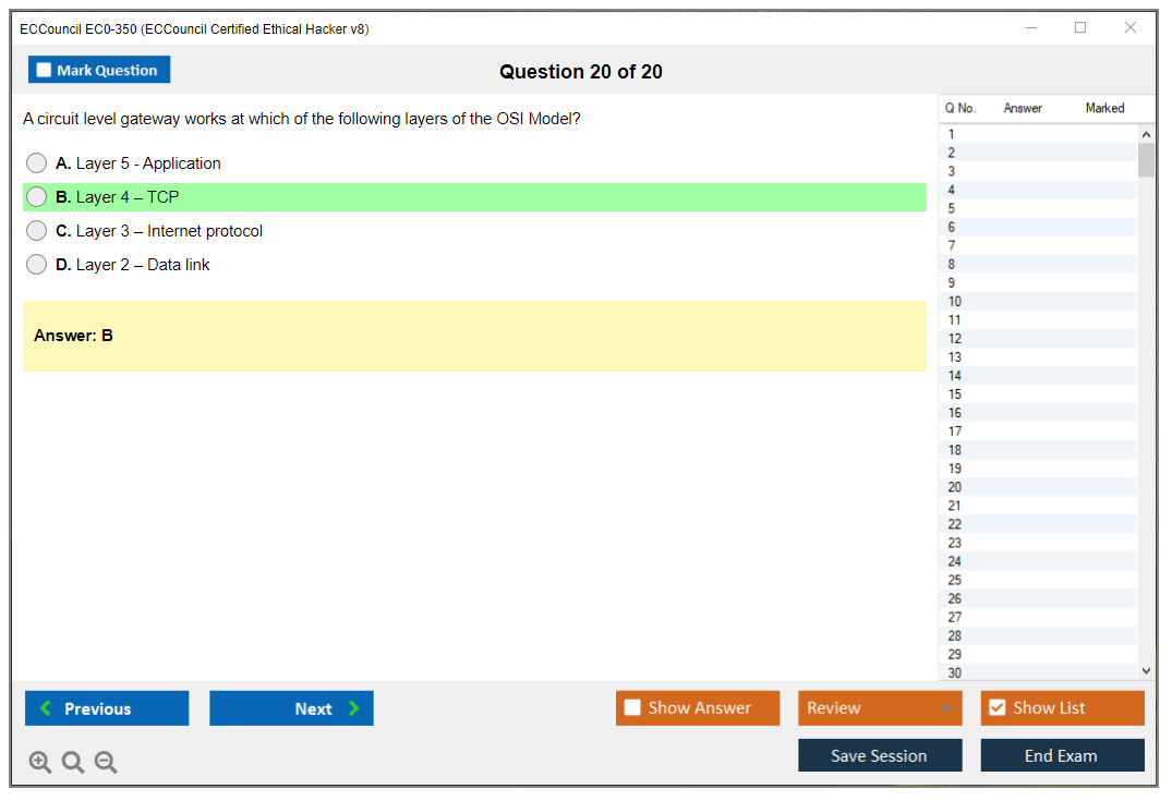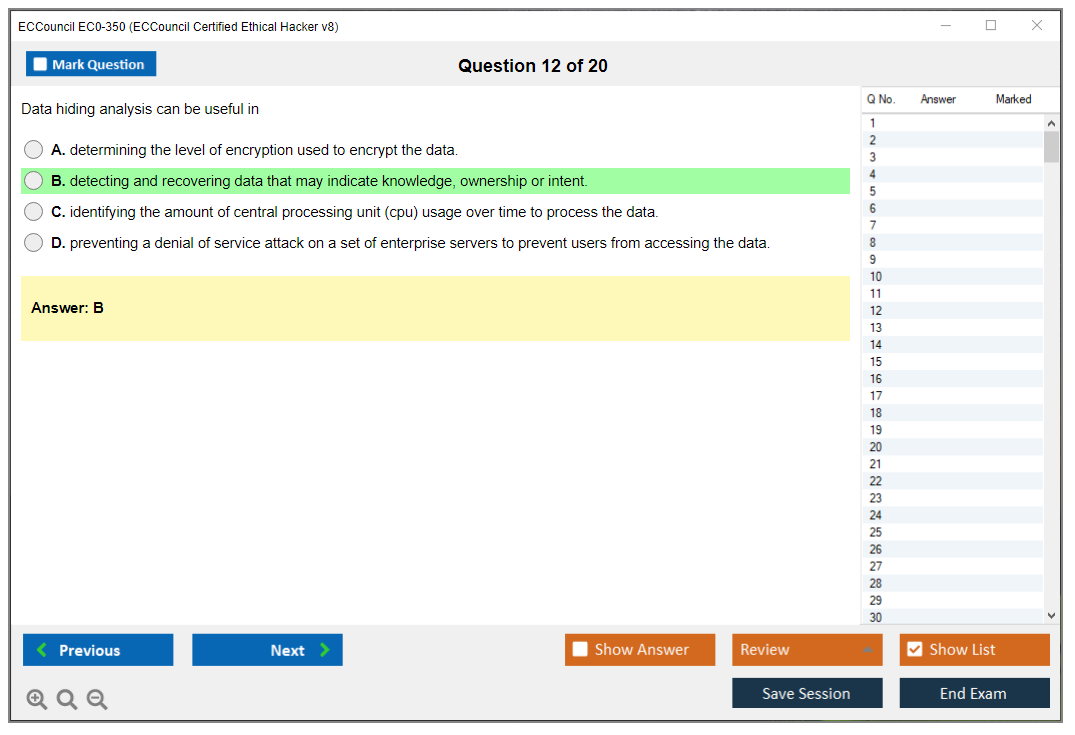 The ECCouncil EC0-350 exam is a certification exam aimed at validating the skills and knowledge of professionals in the field of ethical hacking. The exam covers various topics related to network security, penetration testing, and countermeasures against cyber threats.