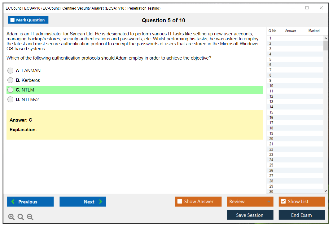 The ECCouncil ECSAv10 (EC-Council Certified Security Analyst (ECSA) v10) is a certification program that focuses on advanced security analysis and penetration testing. It is designed to validate the skills and knowledge required to perform comprehensive security assessments and penetration tests using a variety of methodologies and tools.