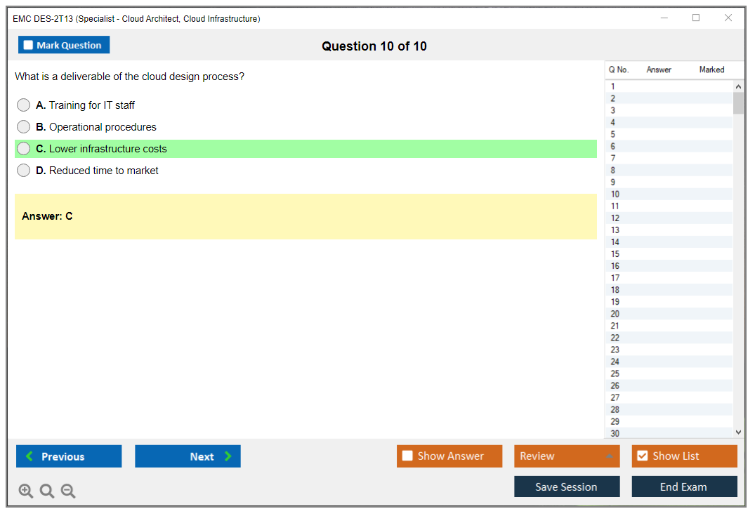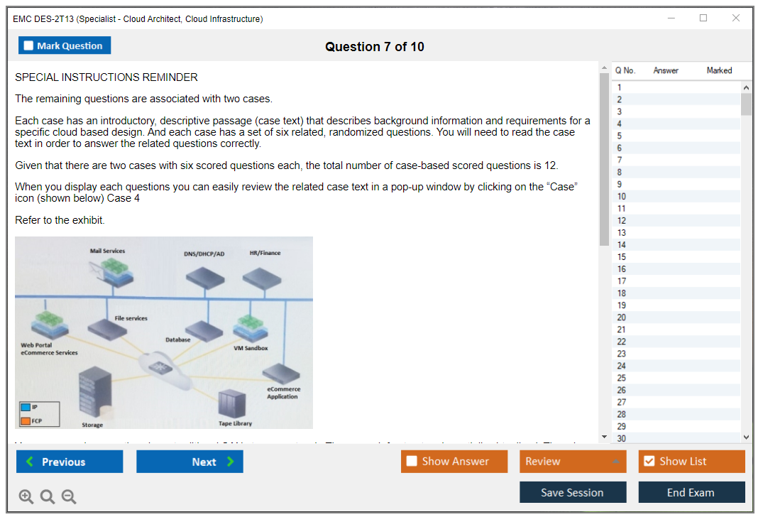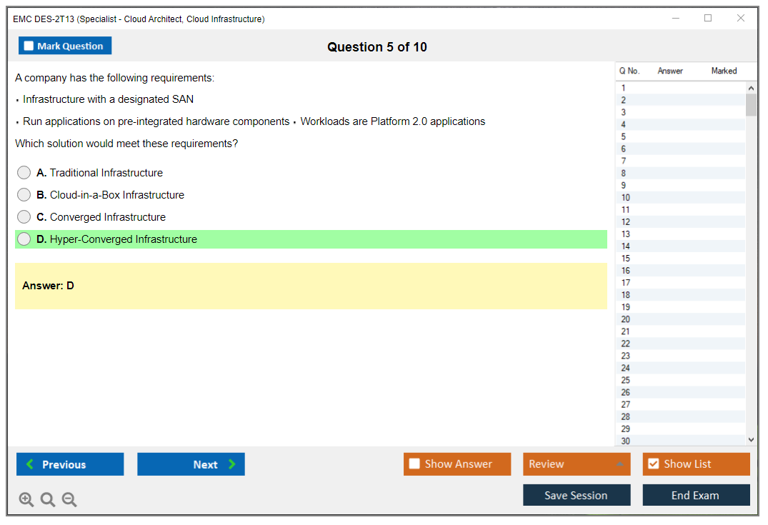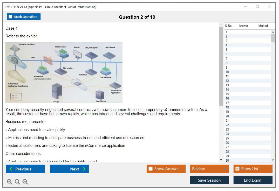 The EMC DES-2T13 (Specialist – Cloud Architect, Cloud Infrastructure Exam) is designed for professionals who want to validate their expertise in cloud infrastructure and architecture. It focuses on advanced cloud concepts, including design, deployment, and management of cloud infrastructure solutions.