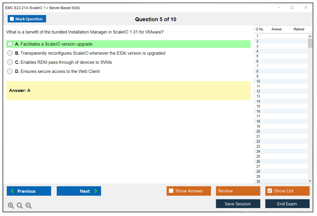 The EMC E22-214 (ScaleIO 1.x Server-Based SAN) Exam is designed to test the knowledge and skills necessary to install, configure, and manage EMC ScaleIO solutions. It covers various aspects of server-based SAN technologies and the specific functionalities of EMC ScaleIO.