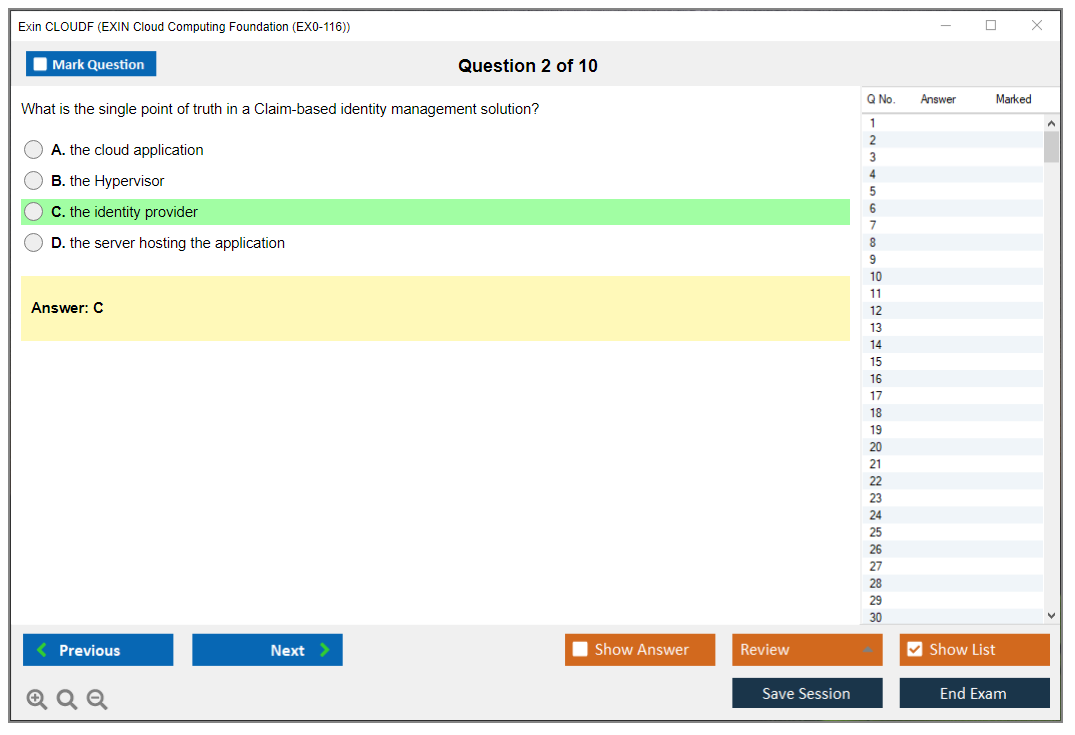 The EXIN Cloud Computing Foundation (CLOUDF) exam provides a comprehensive introduction to cloud computing. It is aimed at individuals who want to validate their understanding of the fundamental concepts and principles of cloud computing.