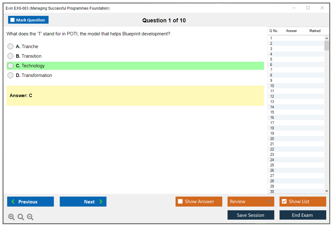 The Exin EX0-003 Exam is a certification exam that evaluates an individual's understanding of the principles, governance themes, and transformational flow processes outlined in the Managing Successful Programmes (MSP) framework.