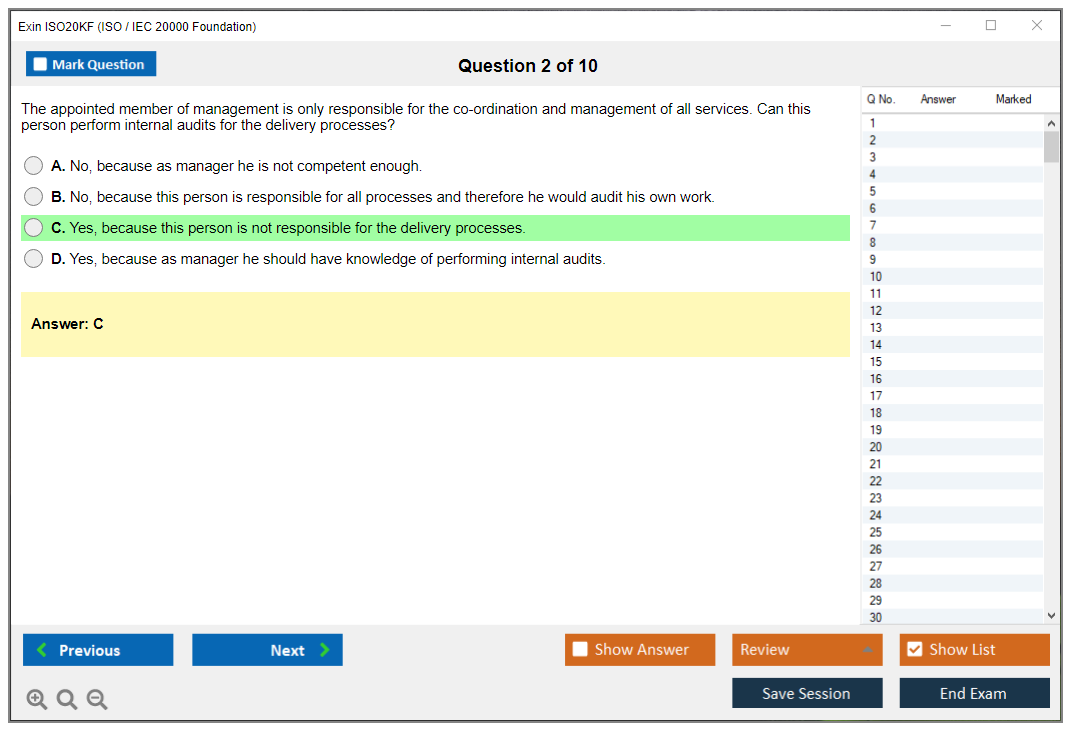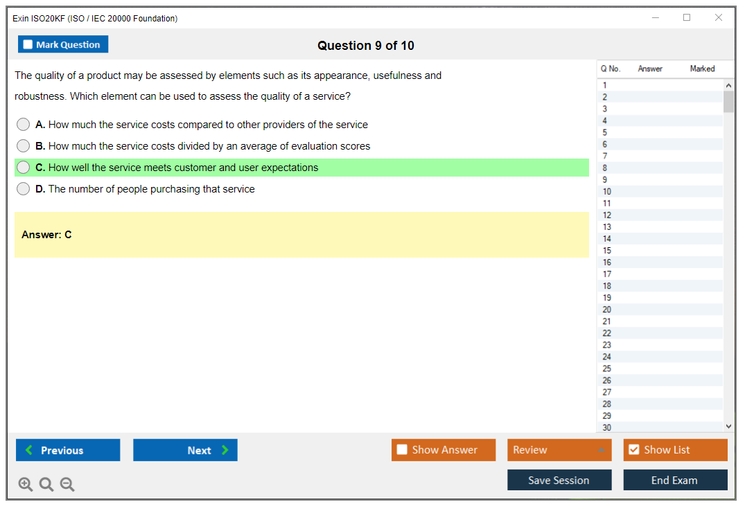The question format of the Exin ISO20KF exam is multiple-choice. Each question has four possible answers, with only one correct answer.