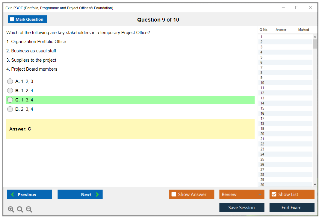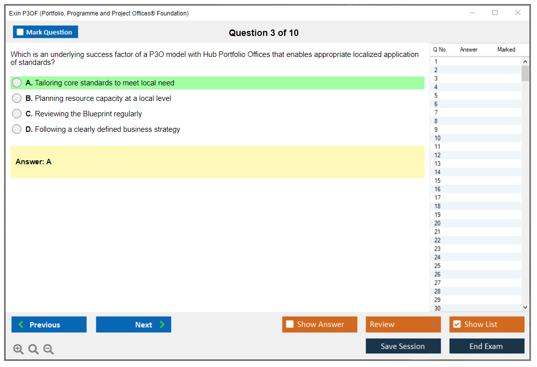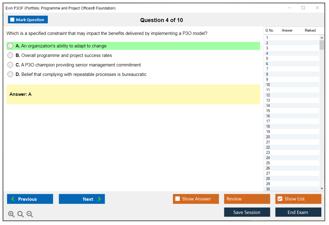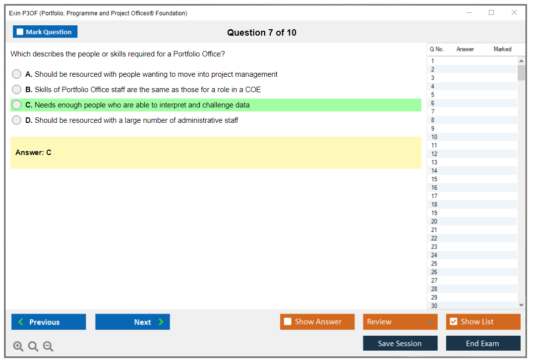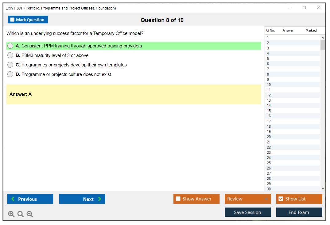 The Exin P3OF (Portfolio, Programme and Project Offices® Foundation) exam is designed to test the knowledge and understanding of the principles and practices of Portfolio, Programme, and Project Offices. It helps professionals understand how to support delivery mechanisms for change within an organization.