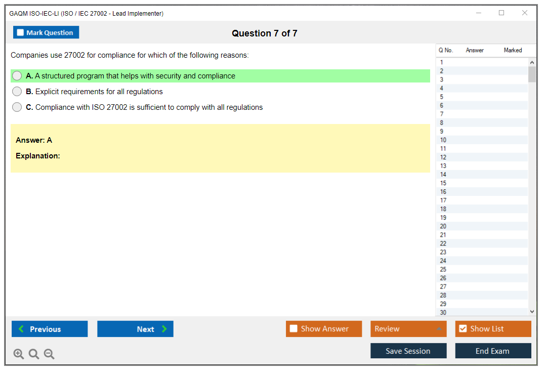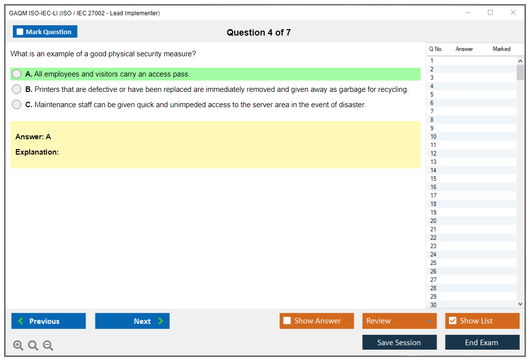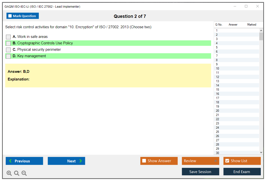 The GAQM ISO-IEC-LI (ISO / IEC 27002 - Lead Implementer) Exam is designed to validate the knowledge and skills required to implement an Information Security Management System (ISMS) based on ISO/IEC 27002. It is aimed at professionals who are responsible for the implementation and management of information security controls.