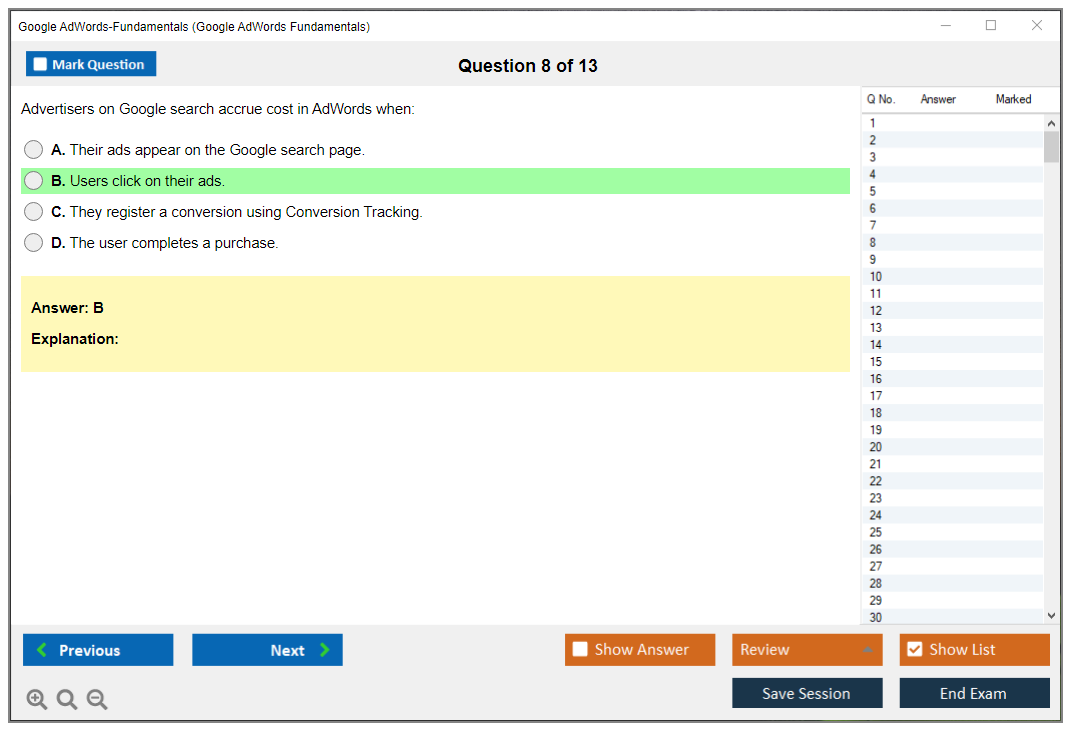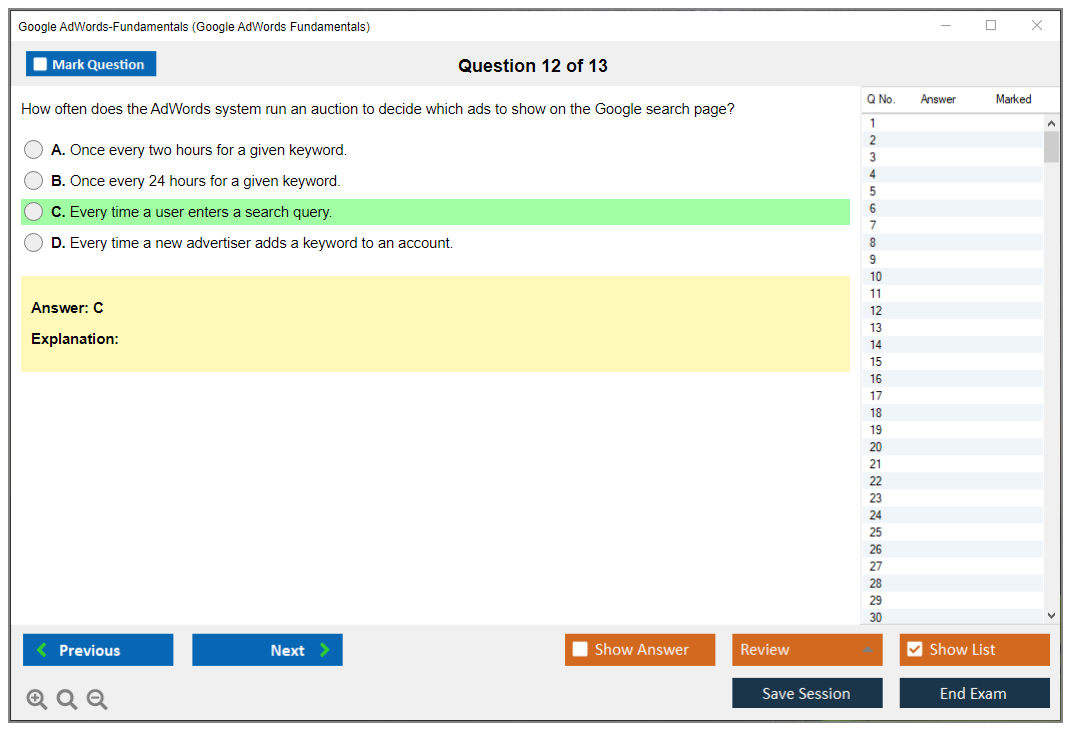 The Google AdWords-Fundamentals Exam is an assessment that covers essential concepts and best practices for managing and optimizing AdWords campaigns. It is intended for individuals who want to demonstrate their proficiency in using Google AdWords.
