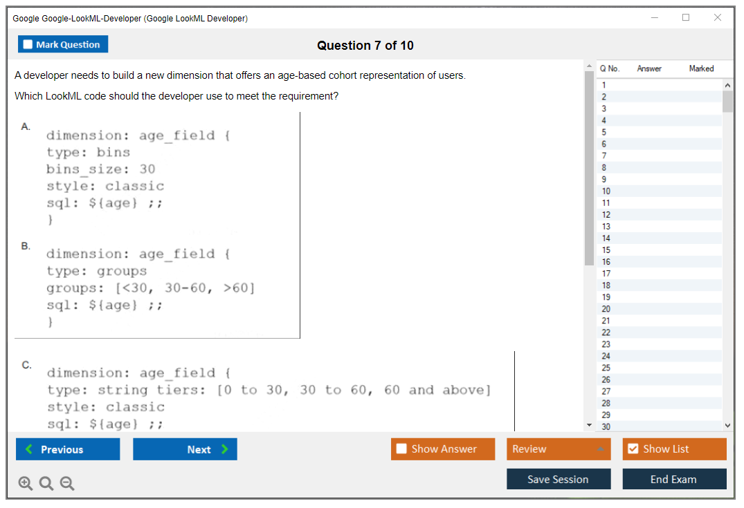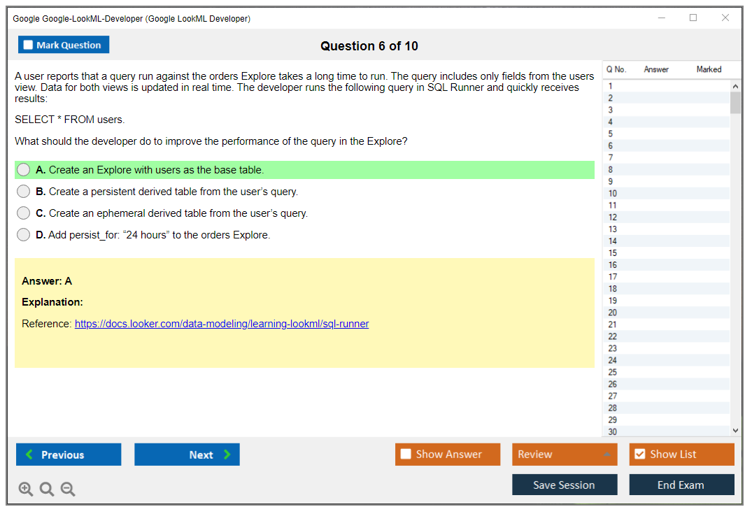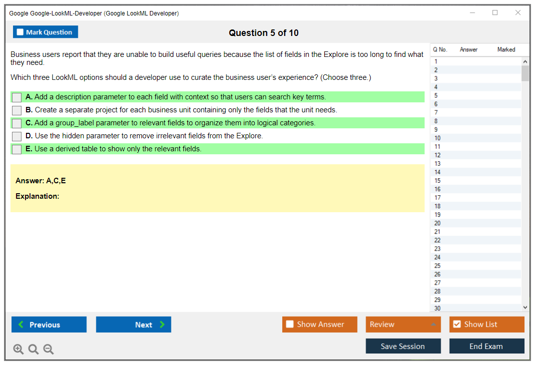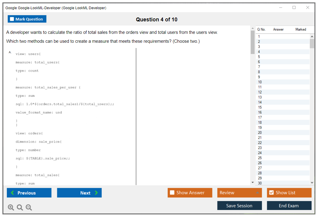 Sample questions for the Google LookML Developer exam can be found on the official Google Cloud certification website or through various exam preparation resources and practice tests.