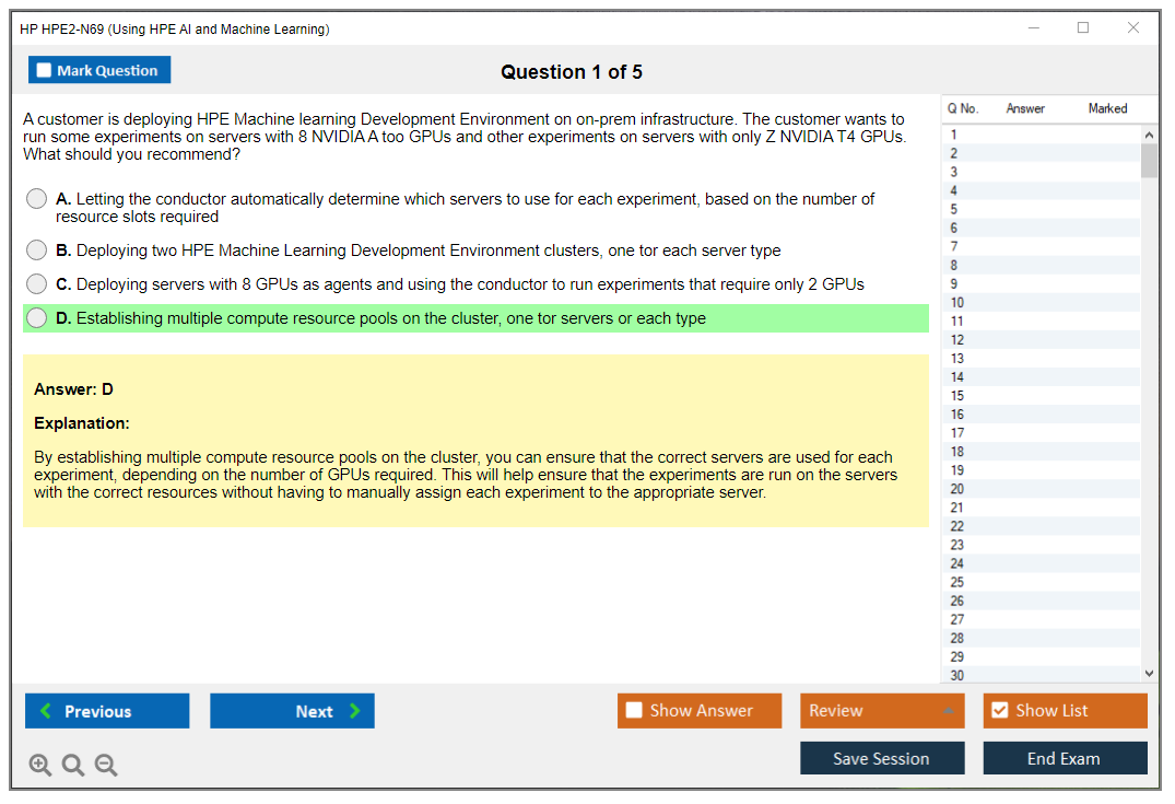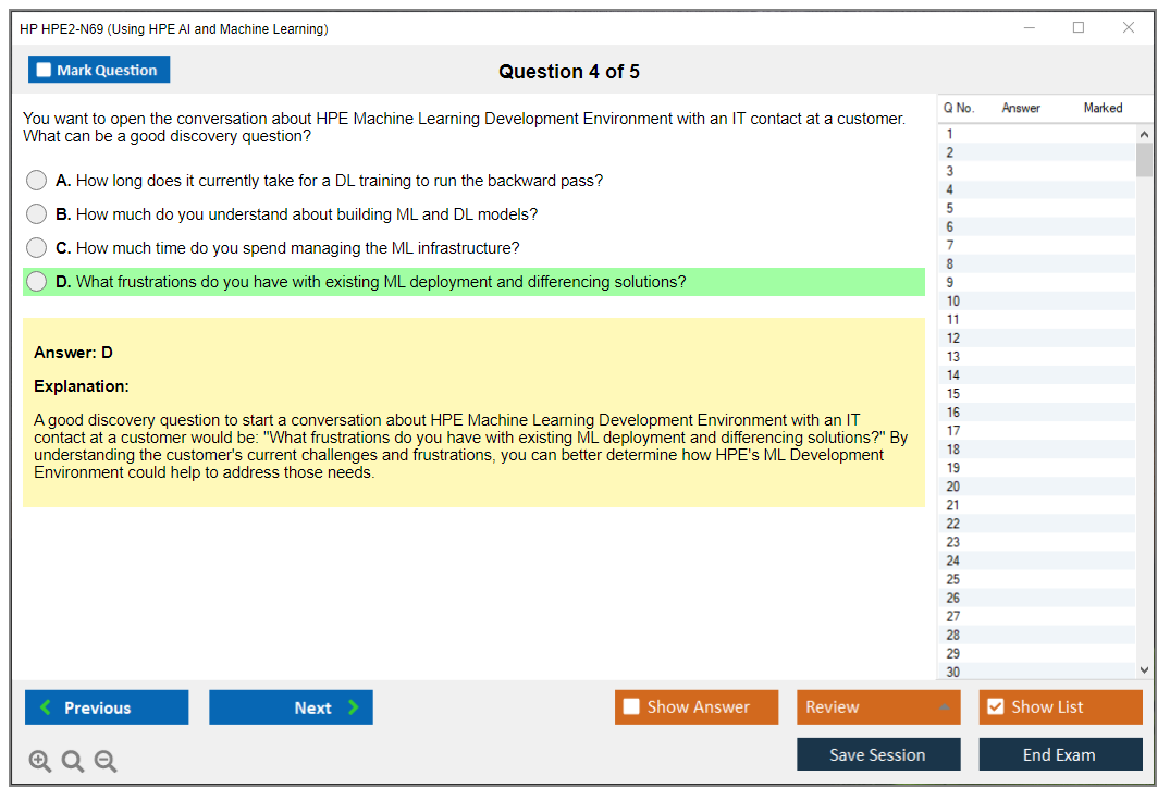 The HP HPE2-N69 (Using HPE AI and Machine Learning) Exam is designed to test the knowledge and skills of individuals in using HPE's AI and machine learning solutions. It covers various aspects such as data analytics, machine learning algorithms, and deployment of AI solutions using HPE technologies.