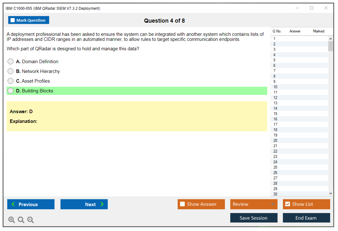 The C1000-055 practice test from DumpsBoss is a fantastic tool for exam preparation. The questions were challenging and realistic, helping me gauge my readiness accurately. The detailed answer explanations were incredibly helpful, allowing me to learn from my mistakes and improve. Thanks to DumpsBoss, I felt confident and well-prepared on exam day. I highly recommend their practice test to anyone aiming to pass the C1000-055 exam.