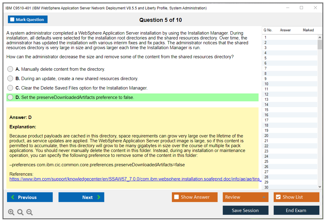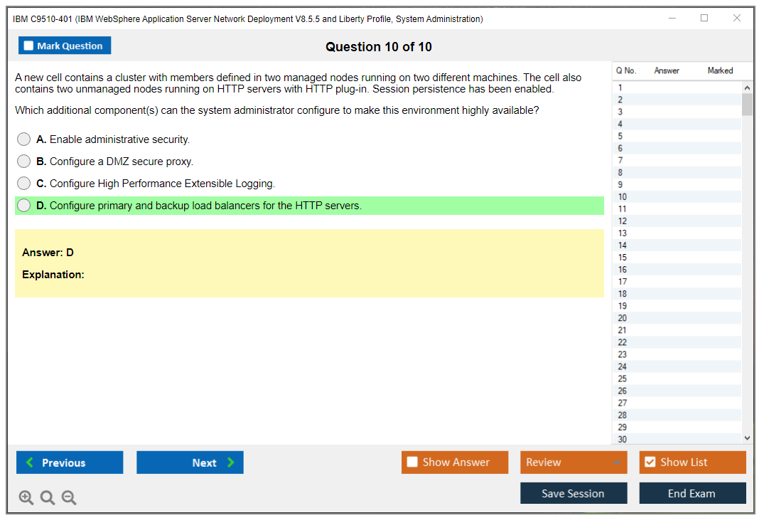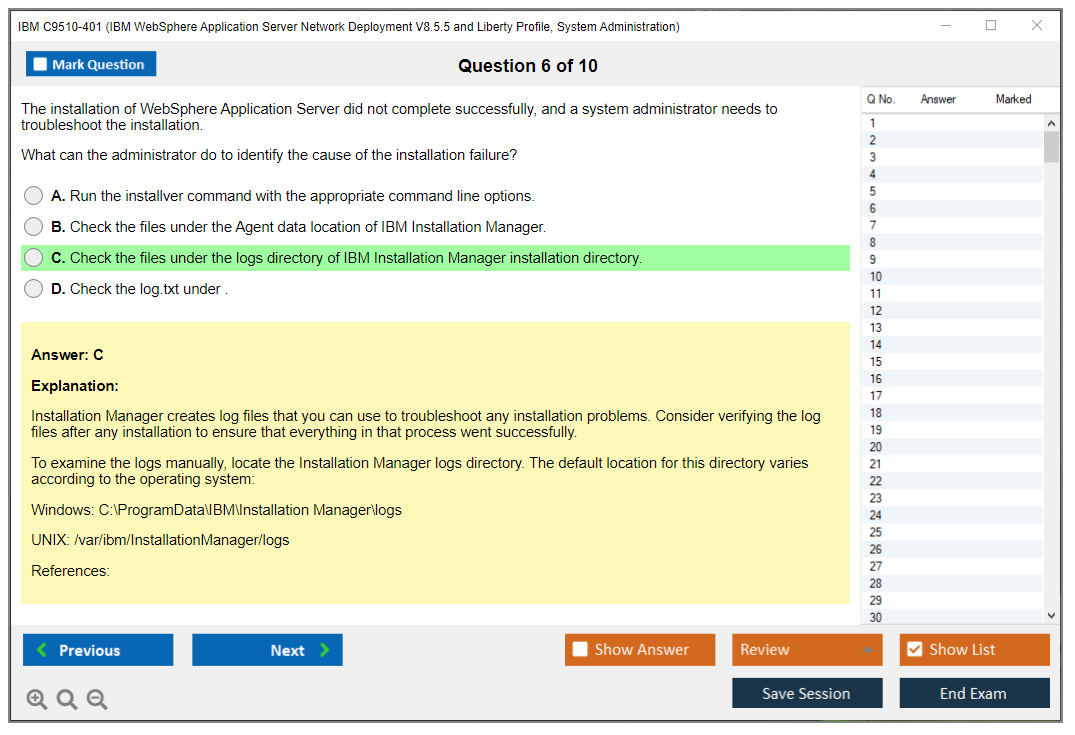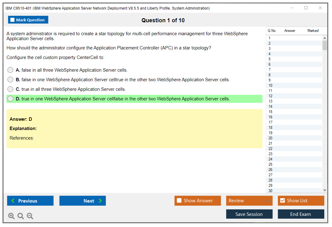 The IBM C9510-401 exam, also known as the IBM WebSphere Application Server Network Deployment V8.5.5 and Liberty Profile System Administration exam, assesses a candidate's skills in managing and configuring IBM WebSphere Application Server environments. This includes knowledge of installation, configuration, and maintenance of the server, as well as troubleshooting and performance tuning.