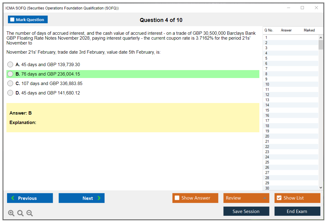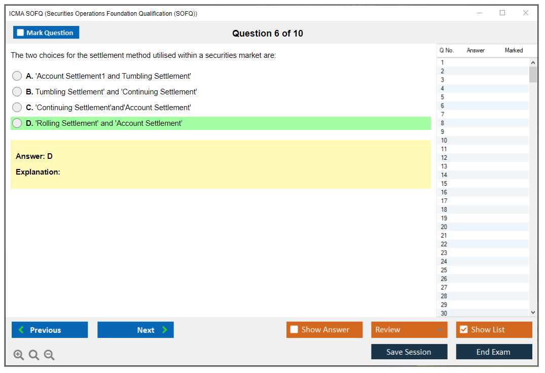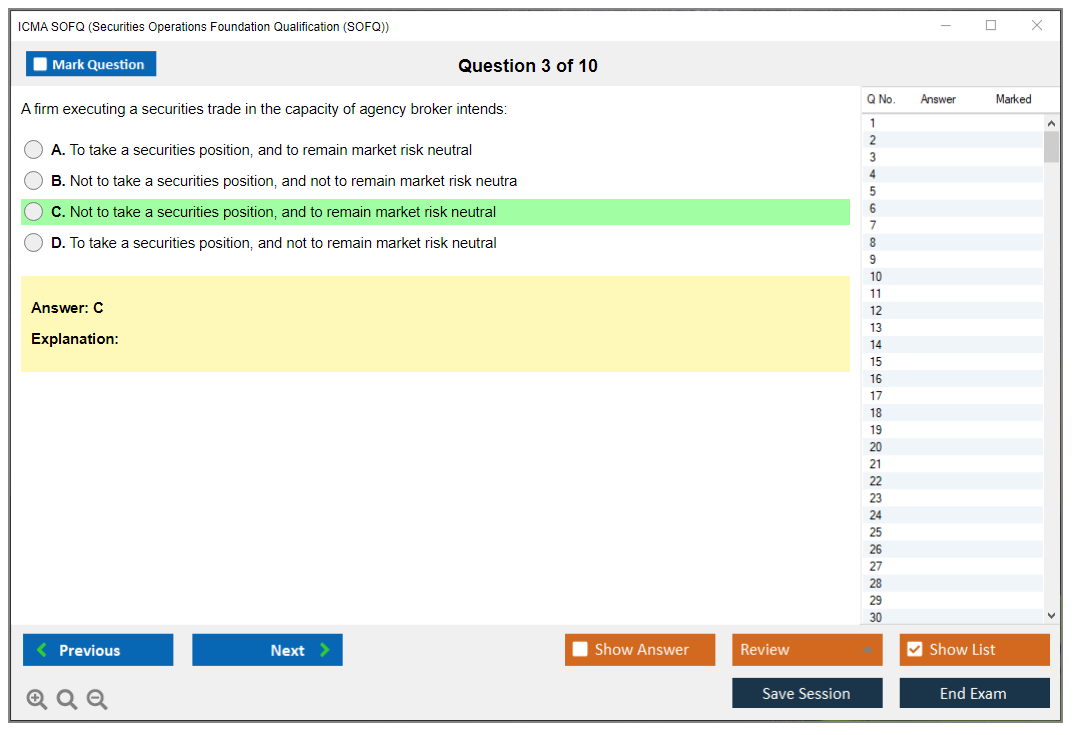 The ICMA SOFQ Exam is an entry-level qualification aimed at individuals entering or working in the securities operations area. It provides foundational knowledge of the securities trade lifecycle, clearing, settlement, and the roles of various market participants.