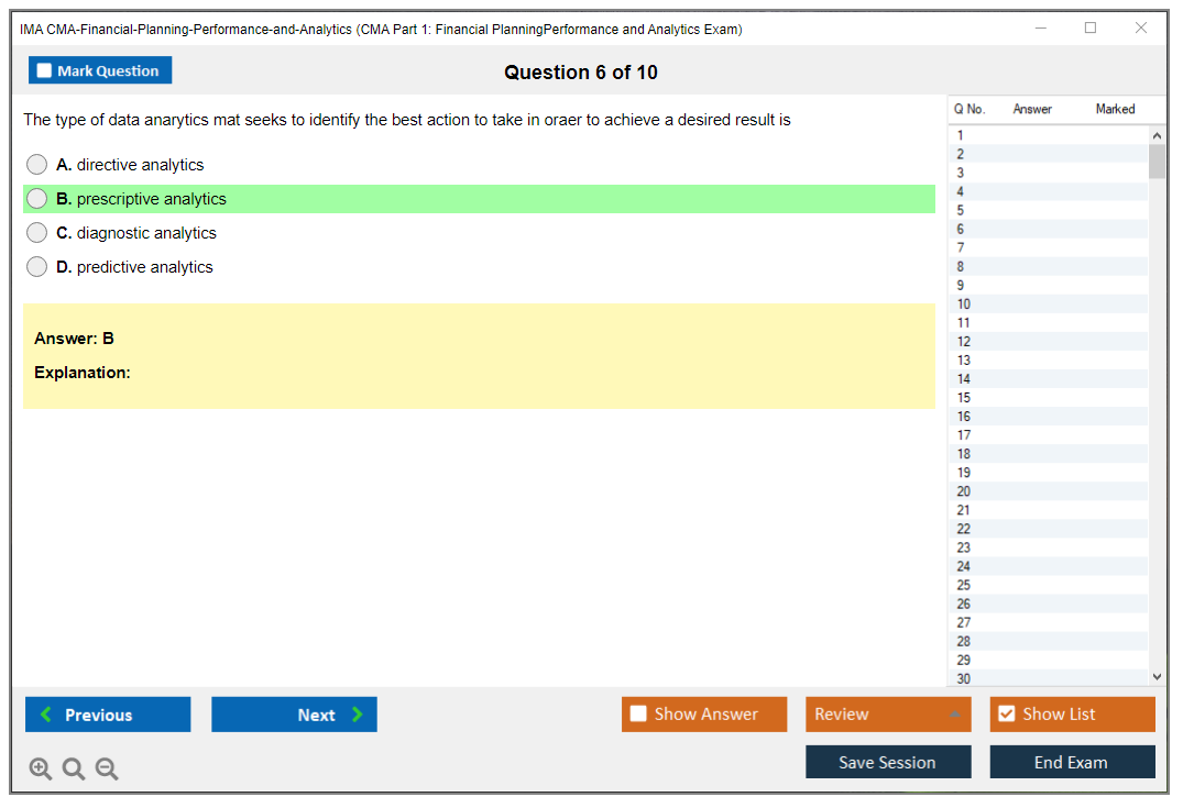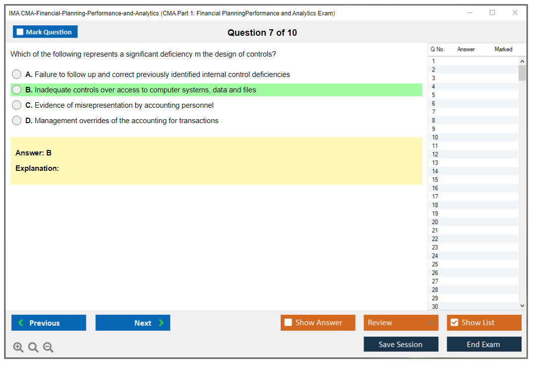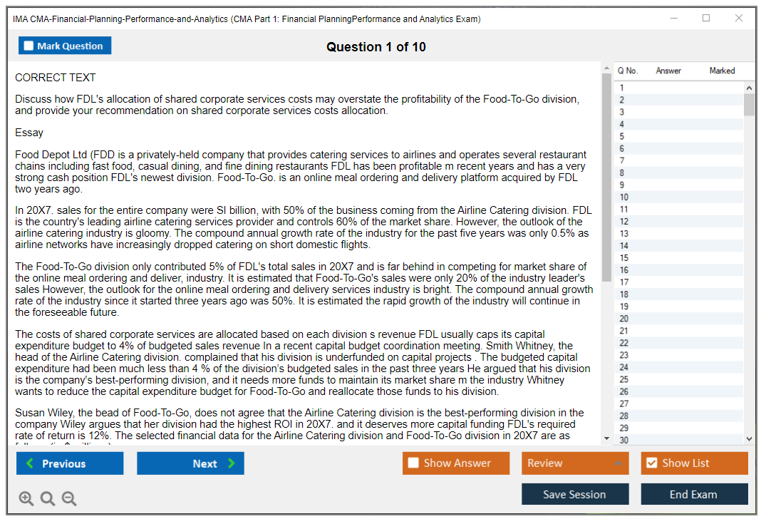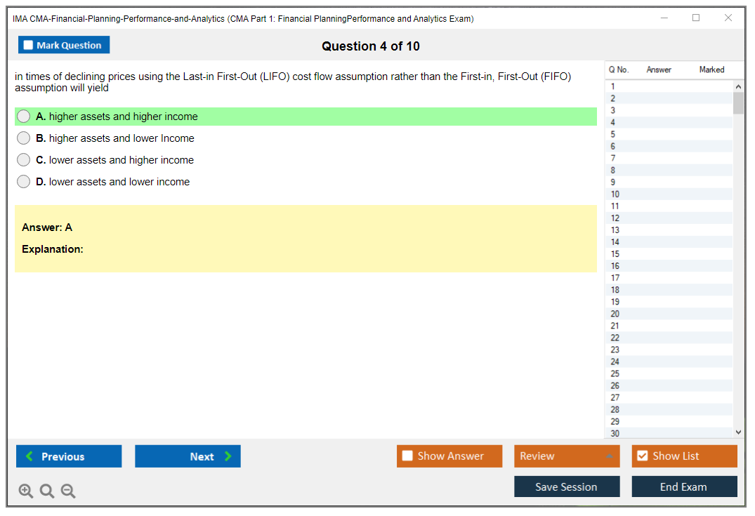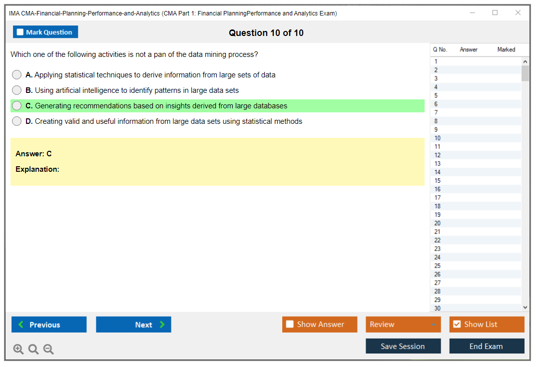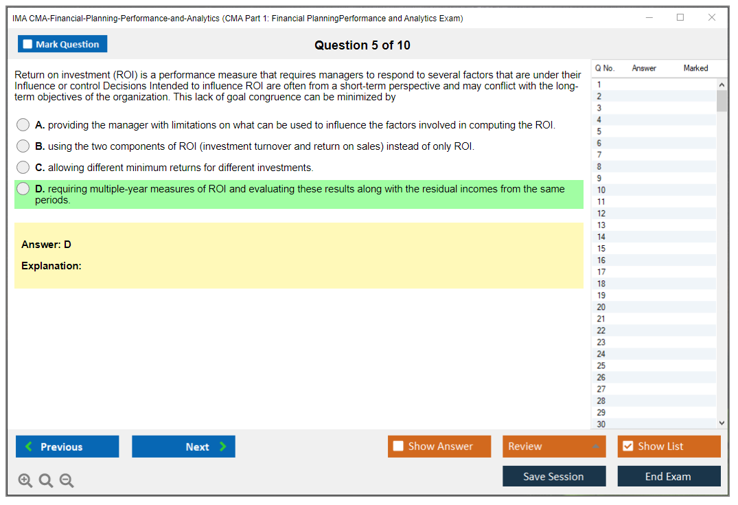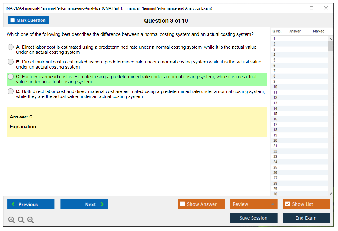 The IMA CMA-Financial-Planning-Performance-and-Analytics Exam, also known as CMA Part 1, is designed to test the knowledge and skills of professionals in financial planning, performance, and analytics. It is part of the Certified Management Accountant (CMA) certification offered by the Institute of Management Accountants (IMA).
