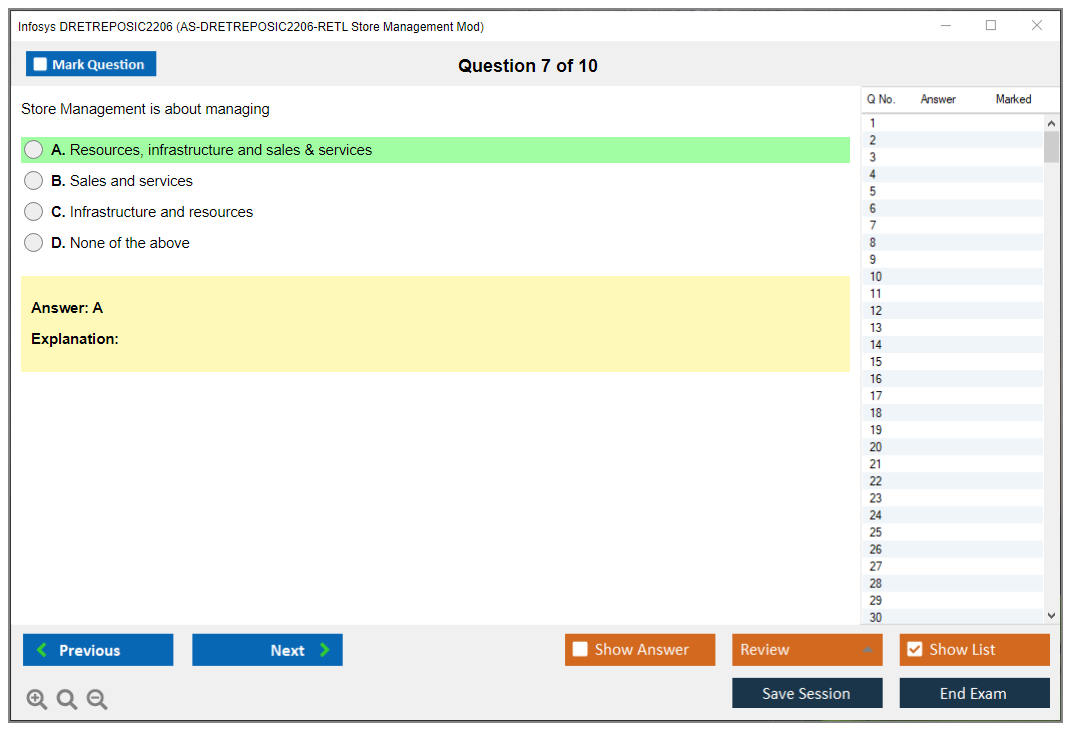 The Infosys DRETREPOSIC2206 (AS-DRETREPOSIC2206-RETL Store Management Mod) Exam is designed to evaluate the knowledge and skills of professionals in store management within retail environments. It covers various aspects of store operations, inventory management, customer service, and retail technologies.
