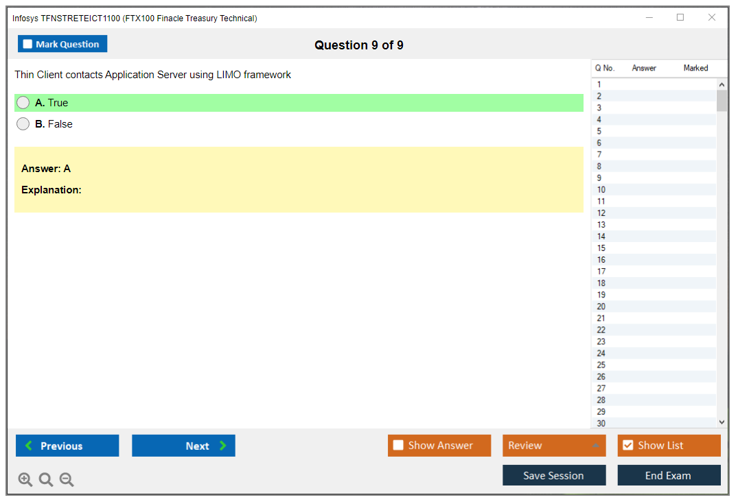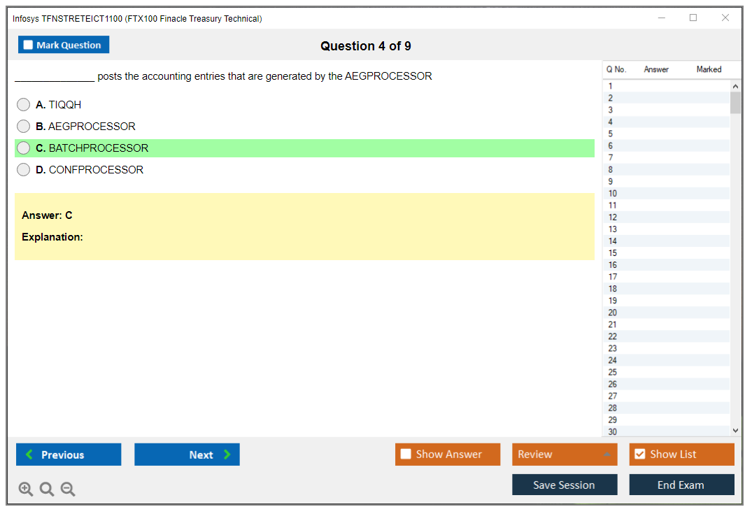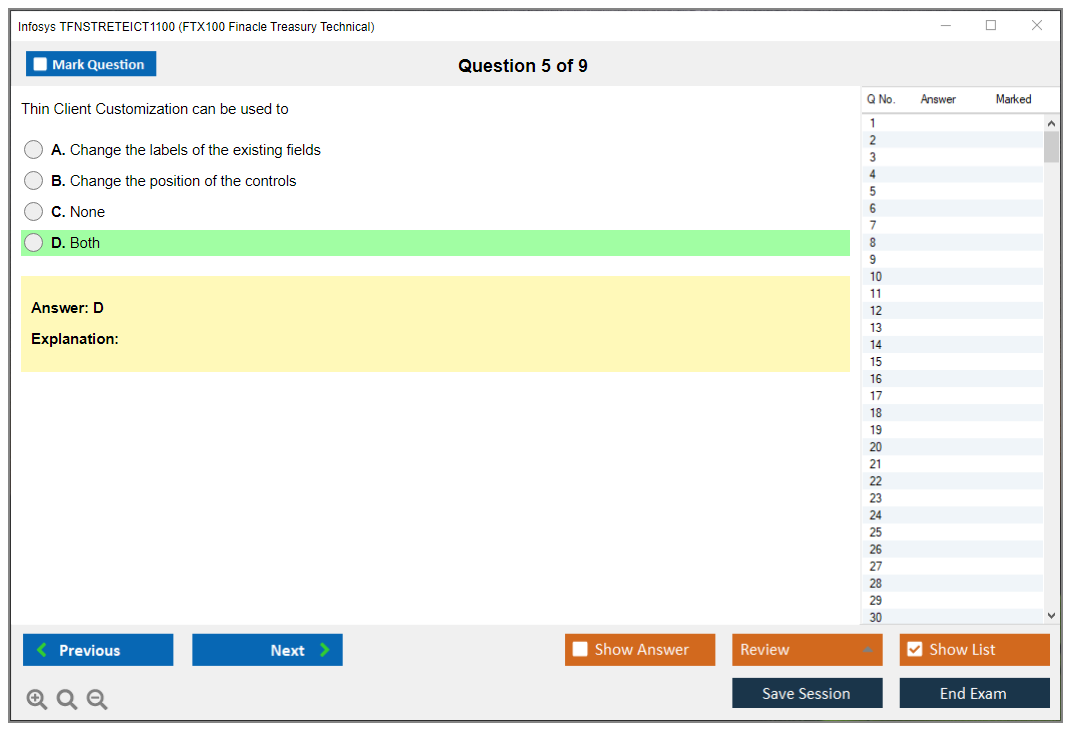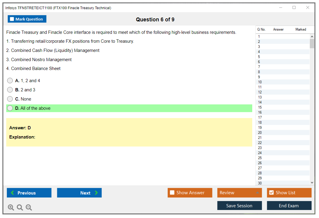 The Infosys TFNSTRETEICT1100 (FTX100 Finacle Treasury Technical) Exam is designed to assess the technical knowledge and skills of individuals in using the Finacle Treasury solution. It covers various aspects such as system architecture, setup, configuration, and troubleshooting.