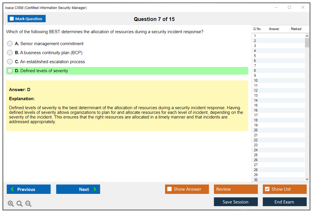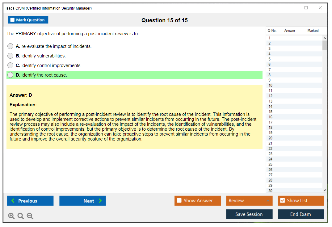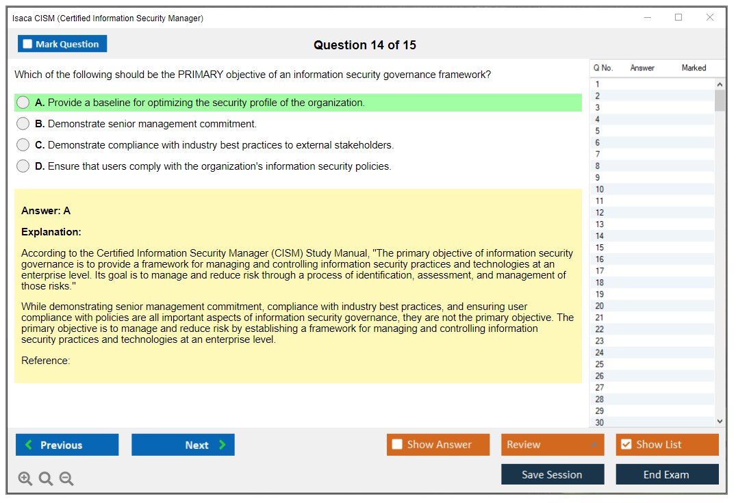 The ISACA Certified Information Security Manager (CISM) exam is a globally recognized certification designed for individuals who manage, design, oversee, and assess an enterprise’s information security. It focuses on the development and management of information security programs and the assessment of risk and incident management.