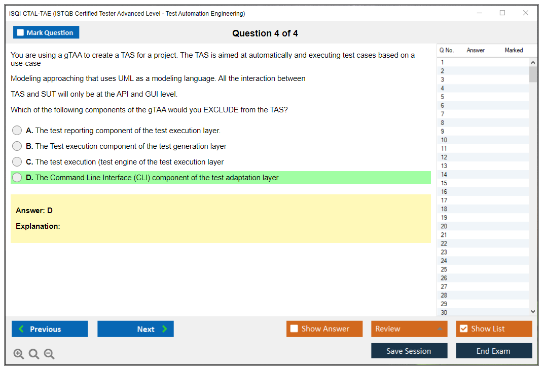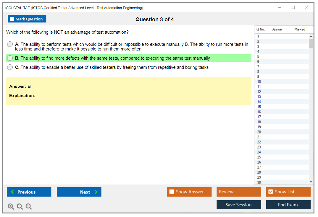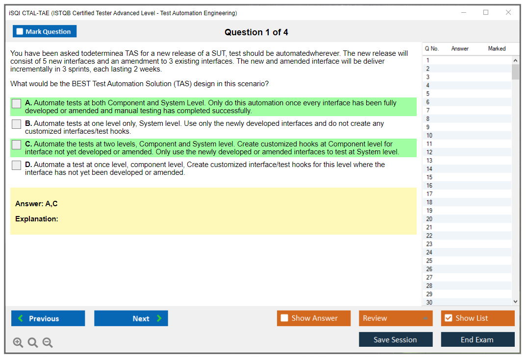 The iSQI CTAL-TAE (ISTQB Certified Tester Advanced Level, Test Automation Engineering) Exam is designed to certify individuals who have advanced software testing skills, particularly in the area of test automation. It validates the knowledge and skills required to design, develop, and maintain test automation solutions.
