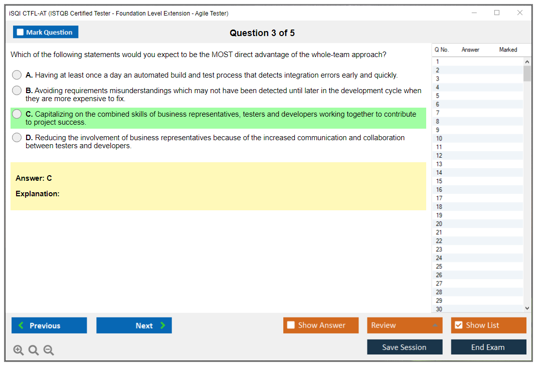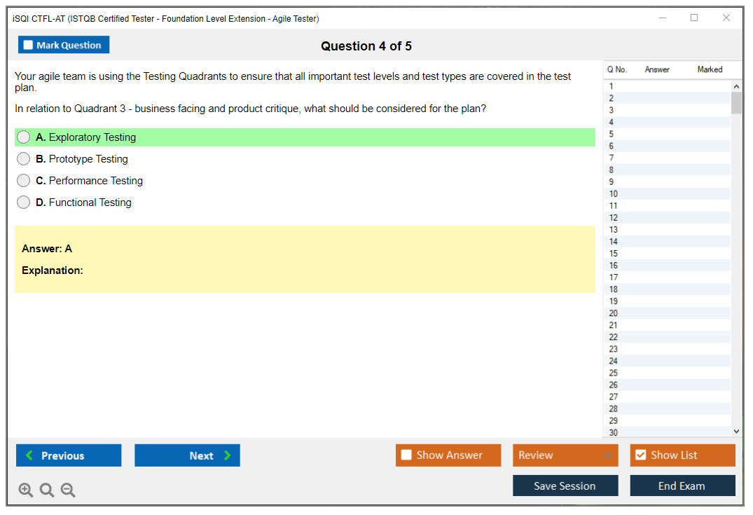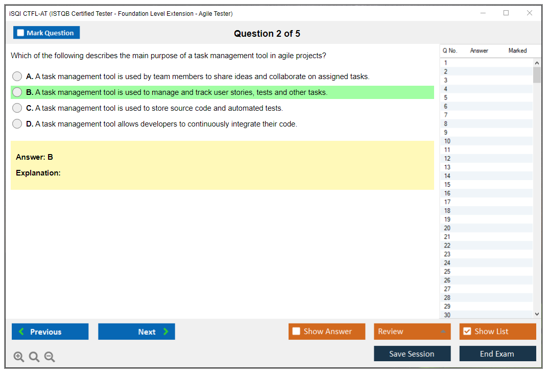 The iSQI CTFL-AT Exam is a certification exam that assesses a candidate's understanding of agile testing methodologies, techniques, and principles. It is aimed at professionals involved in agile projects who seek to validate their expertise in agile testing.