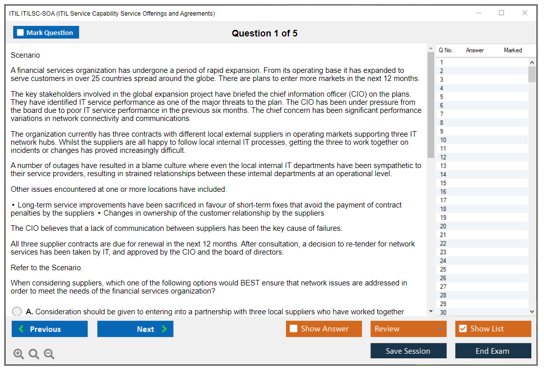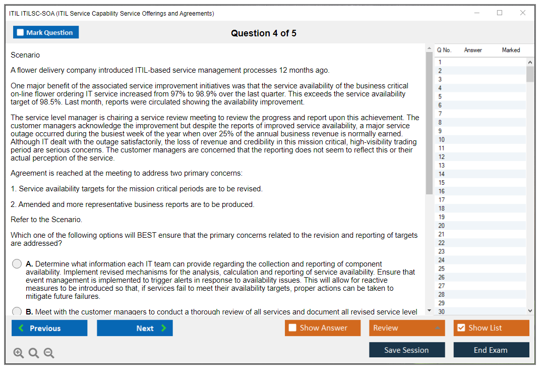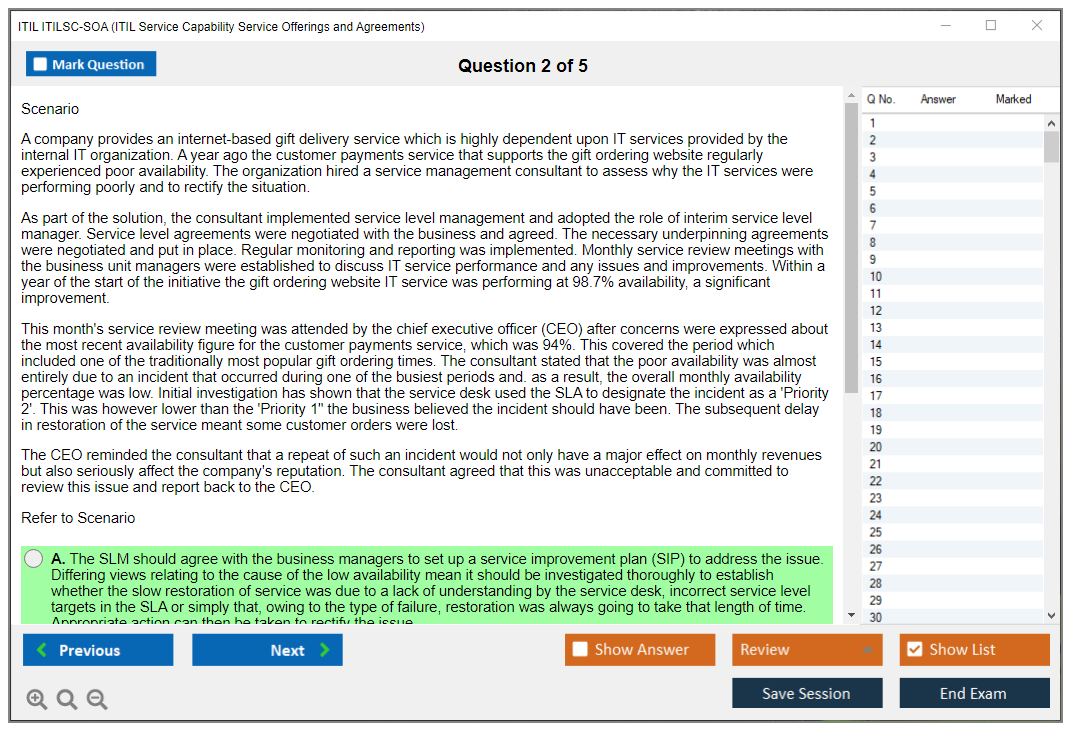 The question format of the ITIL ITILSC-SOA Exam is multiple-choice, scenario-based, and gradient-scored.