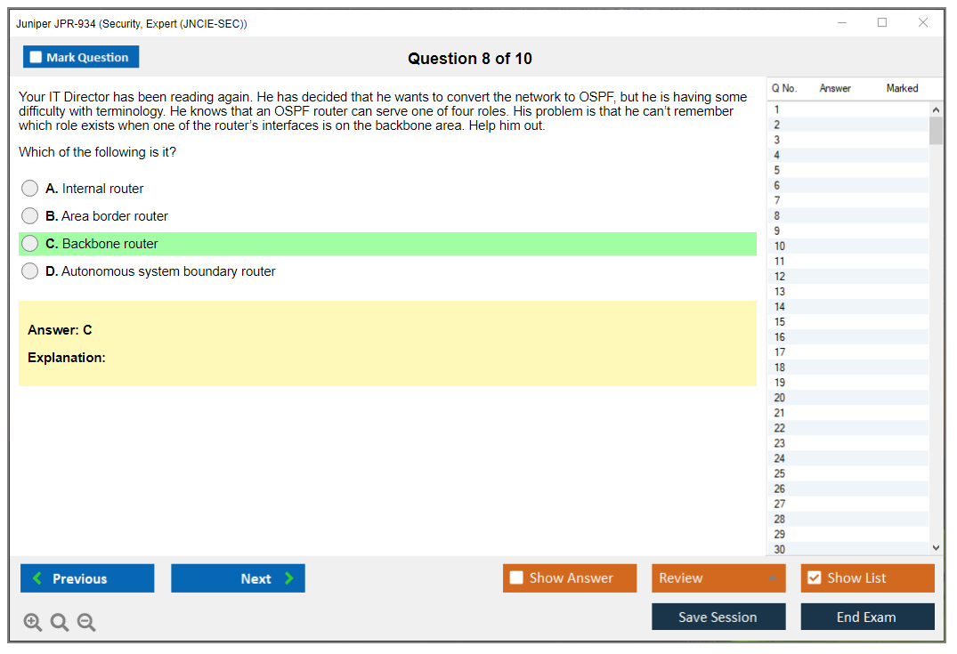 Sample questions for the Juniper JPR-934 exam are not typically provided due to the hands-on nature of the exam. Candidates are encouraged to practice with real equipment and review official Juniper training materials.