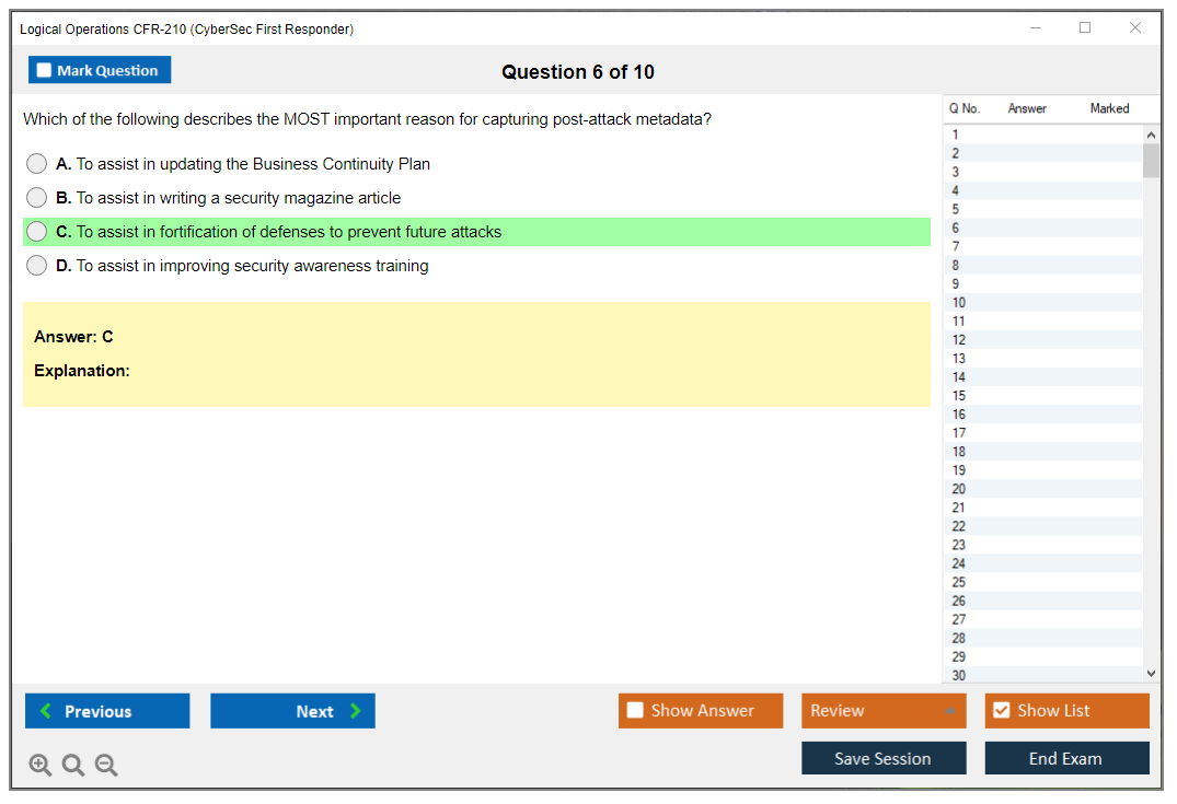The Logical Operations CFR-210 (Logical Operations CyberSec First Responder) exam is designed to validate the skills and knowledge required to detect and respond to cybersecurity threats. It covers topics such as threat detection, analysis, and response, as well as incident handling and vulnerability assessment.