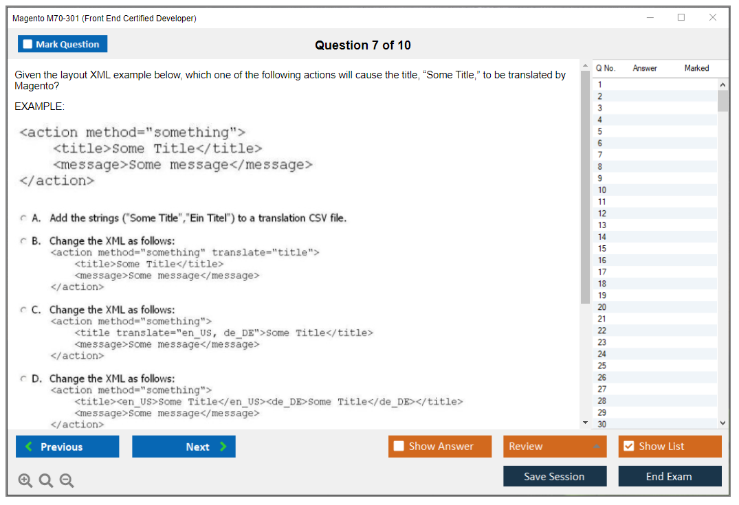 The question format of the Magento M70-301 Exam is multiple-choice questions.